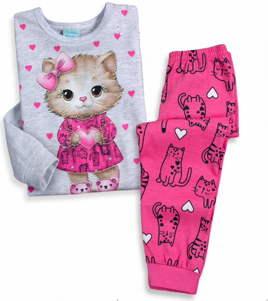 Krásné dívčí pyžamko s kočičkou. Tričko s dlouhým rukávem, pohodlné kalhoty s pružným lemem na nohavici. Obrysy kočičky na tričku ve tmě svítí. Vyrobeno v Brazílii.