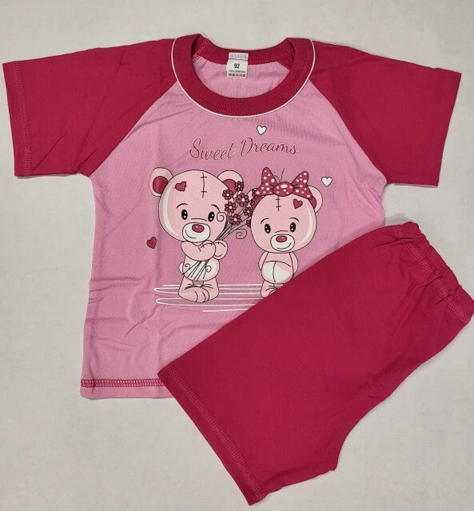 Dětské pyžamo pro dívky s krátkým rukávem a krátkými kalhotami, vyrobeno ze 100% bavlny. Ve více barevných kombinacích s různým potiskem.