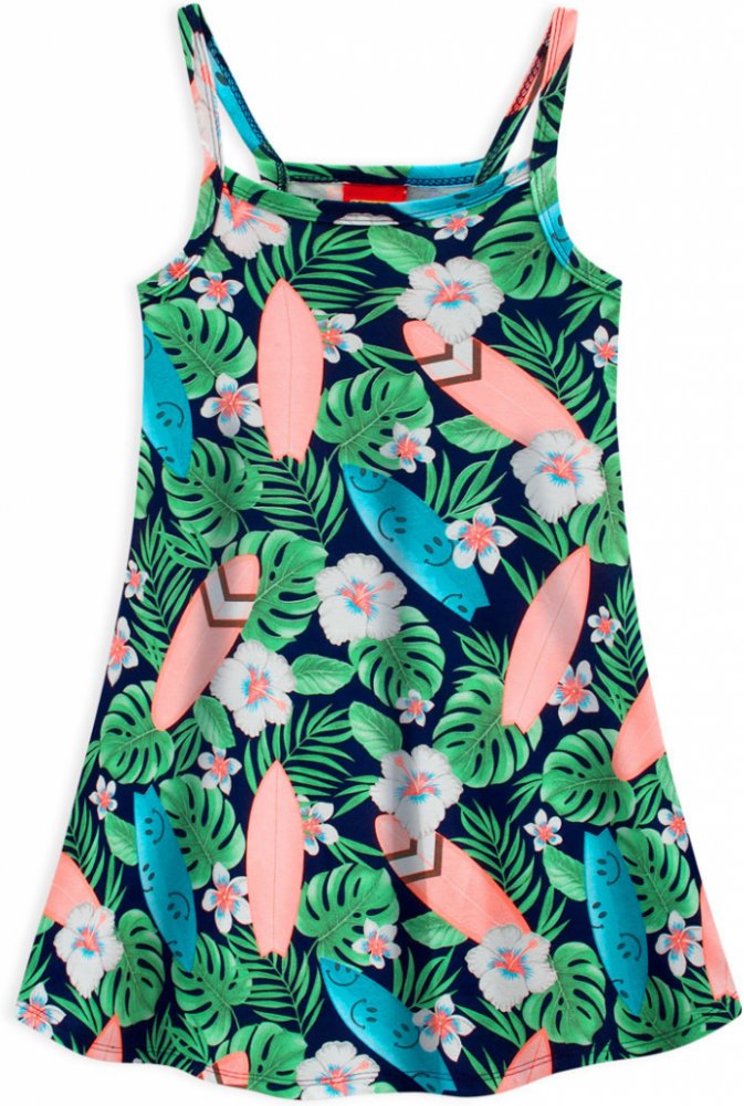 Dívčí letní šaty bez rukávů, s úzkými ramínky. Pohodlný, rozšířený střih. Pružný, měkký úplet s potiskem. Vyrobeno v Brazílii.