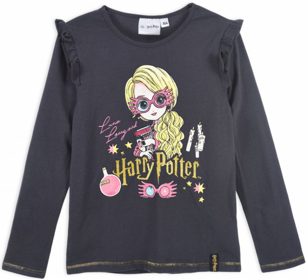 Dívčí tričko s dlouhým rukávem. Krásný barevný potisk Lenky Láskorádové z Harryho Pottera. Pružný bavlněný úplet, na ramenou volánky.