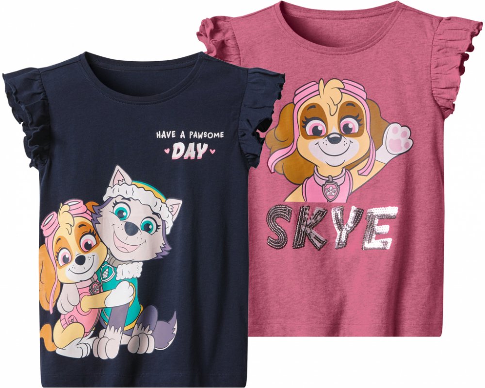 Dívčí triko Tlapková patrola, 2 kusy Vlastnosti Příjemný pocit při nošení díky čisté bavlně Ecoprint - 100 % ekologický tisk na textil 2 kusy Růžová / navy modrá: Volánky na ramenou 1 x s flitry Růžová/bílá: 1 x s metalickým potiskem a nášivkou Charakteristika produktu ;} Barva: růžová / navy modrá; růžová/bílá Vzor: Tlapková patrola Detail: ekologický potisk Střih: není uvedeno Výstřih: kulatý vý...