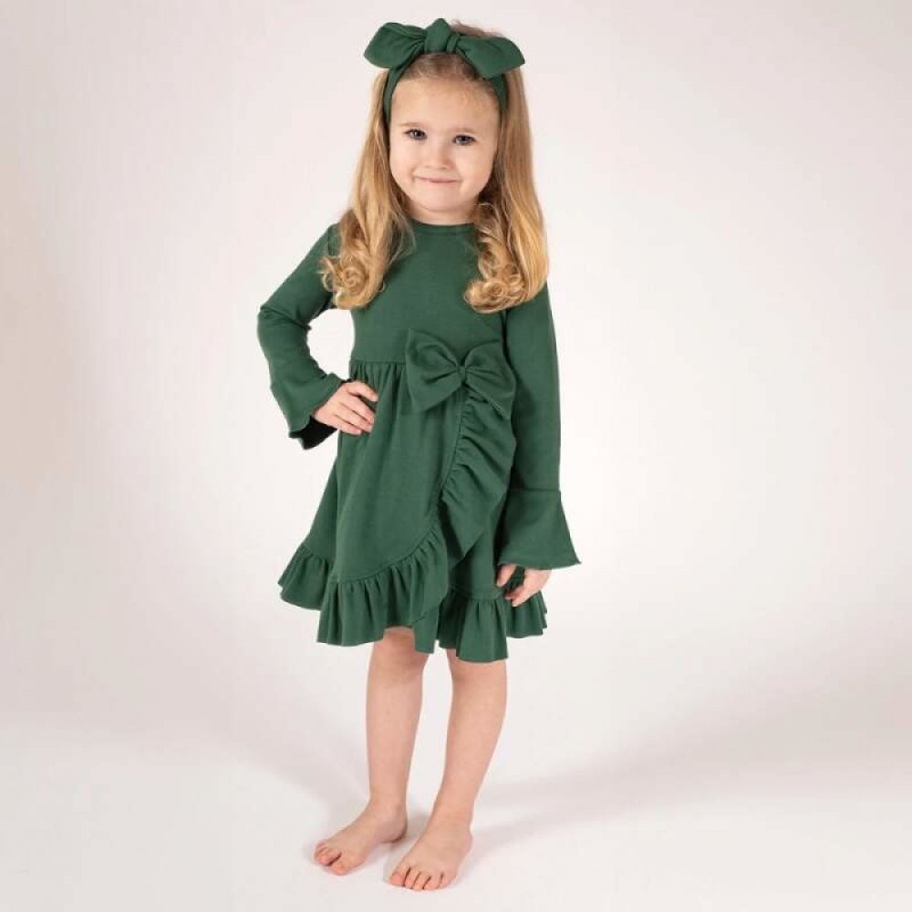 Bavlněné šaty pro dívku v zelené barvě. Šaty s dlouhým rukávem, které se ve spodní části rozšiřují. Zapínání na zádech na patentku ve tvaru slzy bez obsahu niklu. Spodní část šatů a přední díl zdobí mačkaný volánek, který je v pase zakončen zelenou mašlí. Výrobek je certifikován organizací Oeko-Tex Standard 100 Trustworthy Textiles.