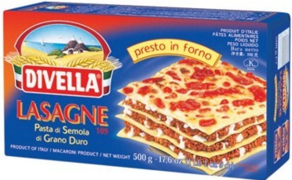 Producent: DivellaNázev česky: Vaječné lasagne ze semolinové moukyNázev italsky: Lasagne SemolaSložení: Semolinová mouka z tvrdé pšenice, voda.Alergeny: Obsahuje lepek.Nutriční hodnoty: