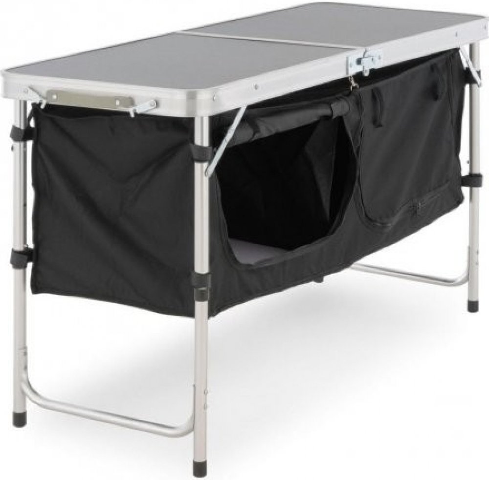 Praktický multifunkční víceúčelový stůl je nepostradatelný pro všechny, kteří rádi tráví čas venku nebo v přírodě. Lze ho použít jako skládací stůl nebo skládací skříňku. Stůl je lehký, sklopný, skládací a výškově nastavitelný do tří poloh. Dva velké úložné boxy pod stolem vám při kempování nabízejí dostatek místa na prádlo či kempingové náčiní. Konstrukce stolu je ze stabilního hliníkového rámu. ...