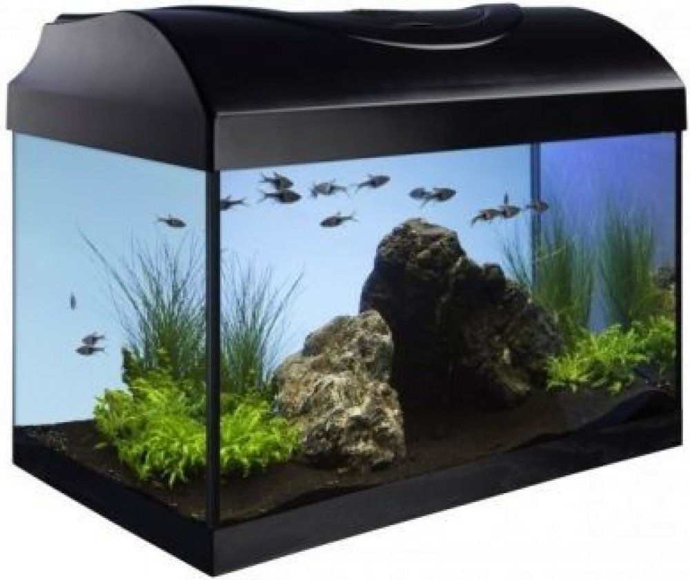 akvárium, kryt s LED osvětlením, spodní ochranný rámeček filtrace, topítko, síťka na rybičky, LED teploměr, vzorky krmiv, příručka akvaristy *