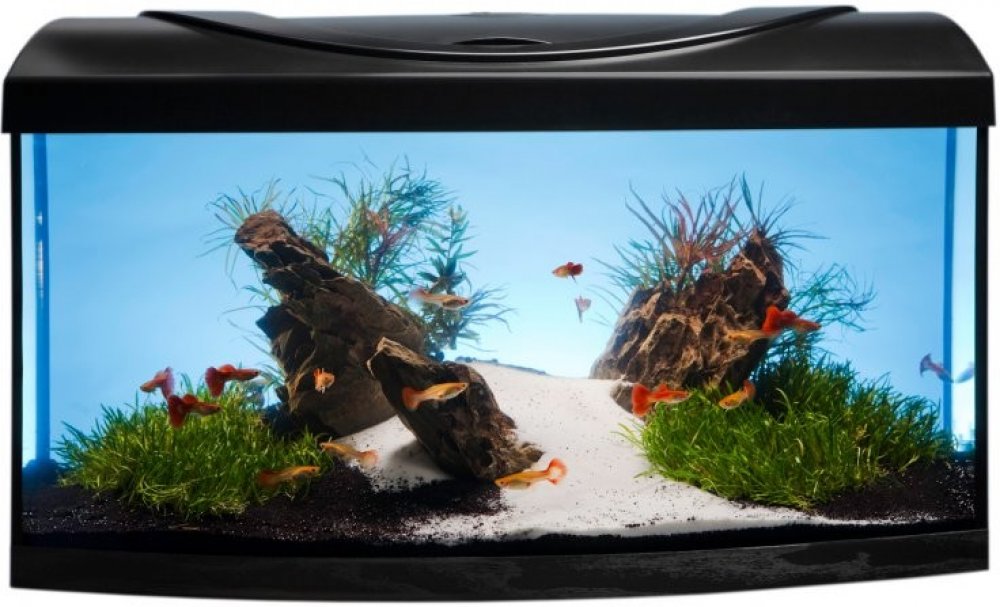 akvárium, kryt s LED osvětlením, spodní ochranný rámeček, filtrace, topítko, síťka na rybičky, LED teploměr, vzorky krmiv, příručka akvaristy *