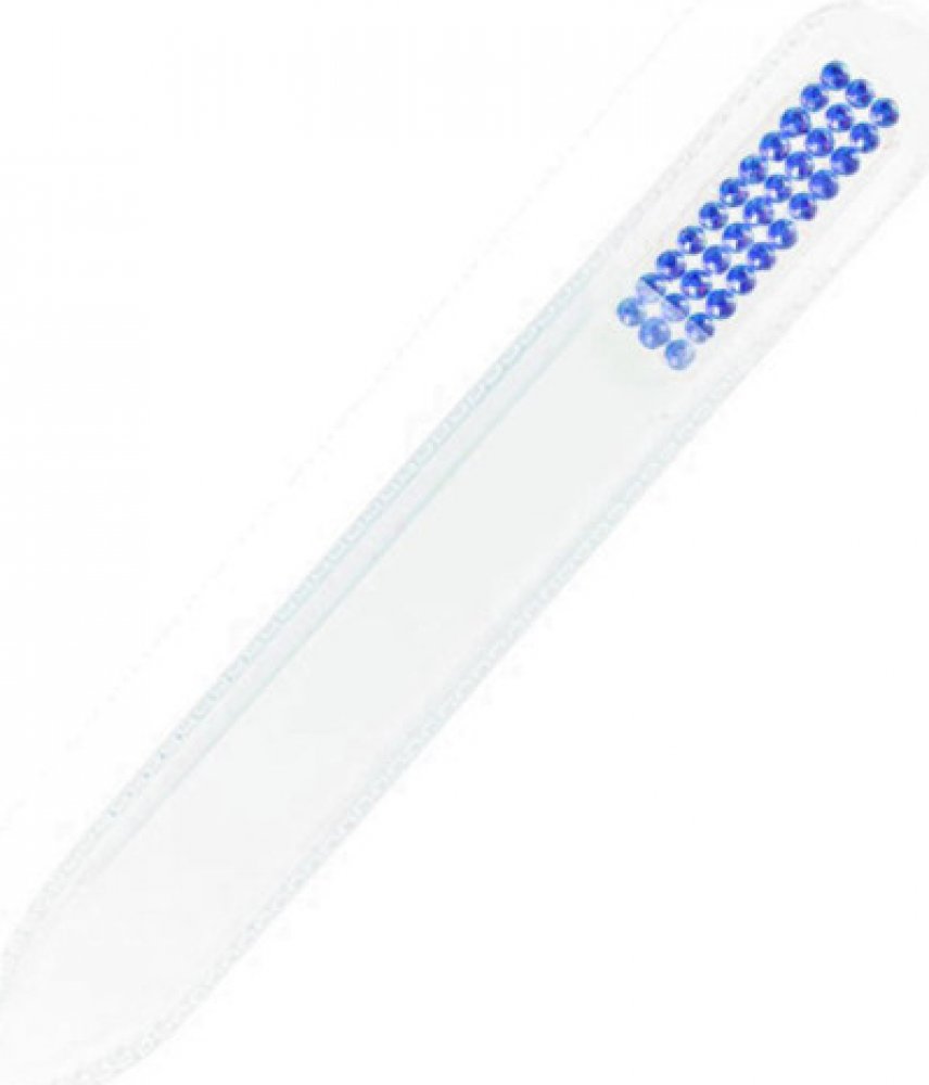 Pilník na přírodní nehty skleněný, oboustranný s barevnými kamínky na rukojeti má rozměry 140 x 12 x 2 mm. Pilník je balen v plastovém pouzdře.