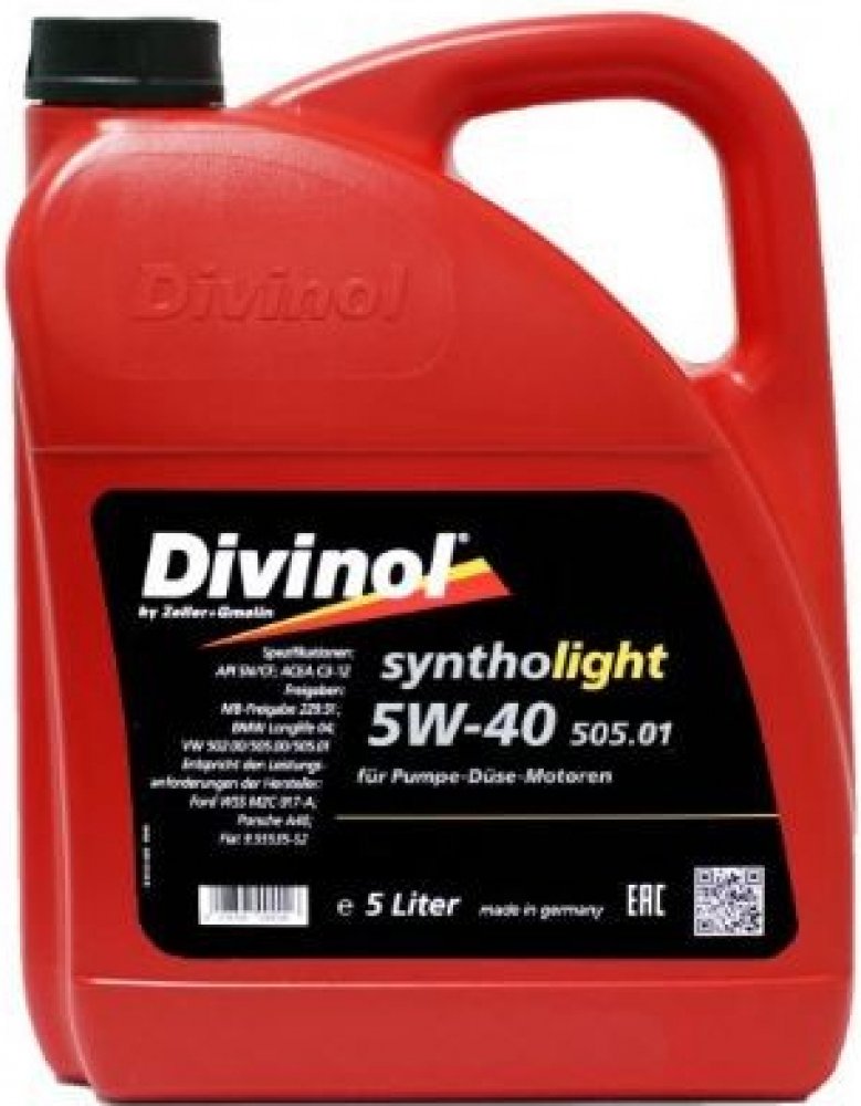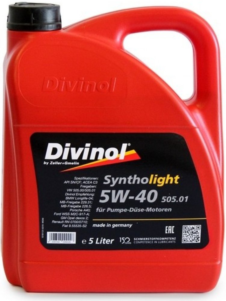 DIVINOL SYNTHOLIGHT 505.01 SAE 5W-40 je syntetický motorový olej pro lehký chod, který je přizpůsoben především požadavkům (konceptu naftových motorů čerpadlovstřikovací tryska) motorů VW TDI. Olej se vyznačuje složením nové generace.