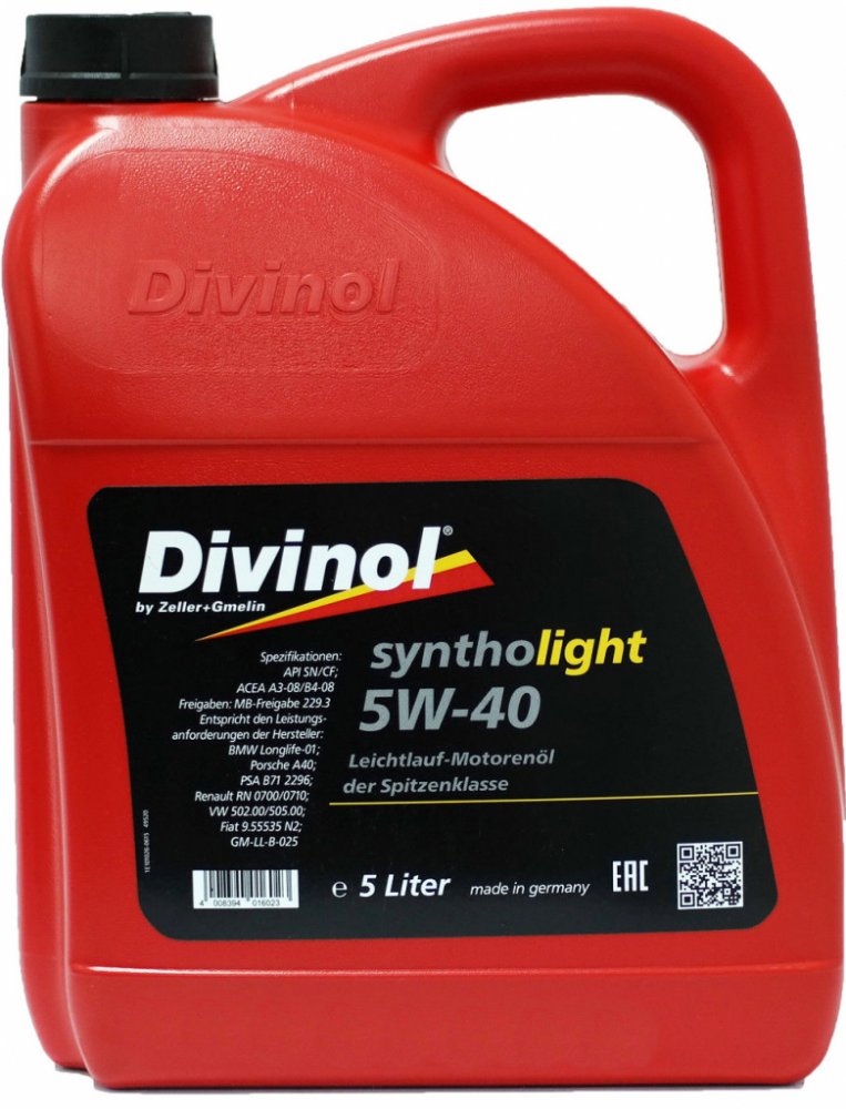 DIVINOL SYNTHOLIGHT 5 W-40 je vysoce výkonný olej pro lehký chod, který byl navržen speciálně pro osobní automobily s benzínovým a naftovým motorem včetně turbodmychadel.