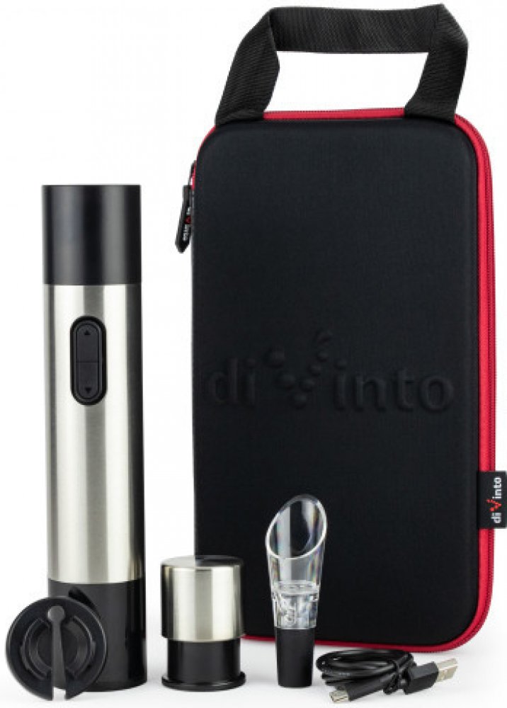 diVinto DuoTwister elektronická vývrtka s magnetickým otvírákem vám pomůže otevřít skoro každou láhev vína za docela krátkou dobu.Sada obsahuje černou elektrickou vývrtku DuoTwsiter, řezačku na fólii, provzdušňovací nálevku, vakuový uzávěr, USB-C kabel a elegantní pouzdro.Otvírák jednou stranou snadno otevře víno s korkem a druhou pivní lahev. Otvírák má zabudovaný magnet, aby při otevření piva zachytil vršek.Ihned možné darovat jako dárek, není potřeba žádné další balení.Pouzdro je vyrobeno z tvrdého a pevného materiálu, který chrání obsah před rozbitím. Díky lehkému a kompaktnímu provedení lze snadno sbalit do tašky, batohu nebo kufru.Rozměry: 28,5 cm (výška), 17 cm (šířka).Výrobek má vestavěnou baterii (dobíjecí baterie).Rozměry v balení: 7,0 x 17,0 x 28,5 (cm)Hmotnost: 0,75 kg.