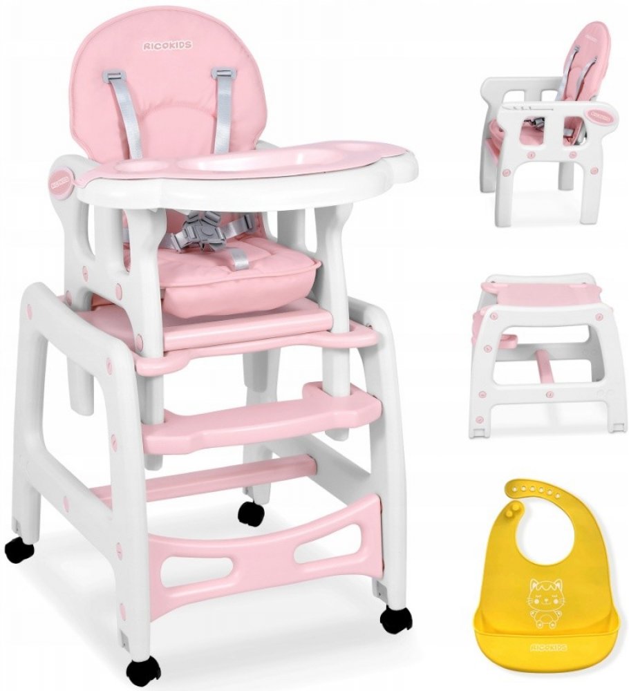 Moderní multifunkční jídelní dětská židle ke krmení, učení a hraní, určené pro děti od 6 měsíců do 3 let. Jeho funkci můžete snadno změnit v závislosti na vašich potřebách a potřebách vašeho dítěte. Židle může fungovat jako houpačka, židle s tácem na krmení, menší i větší židle bez tácu, ale i stůl se židlí! Jak vaše dítě poroste, může židle projít dalšími proměnami!