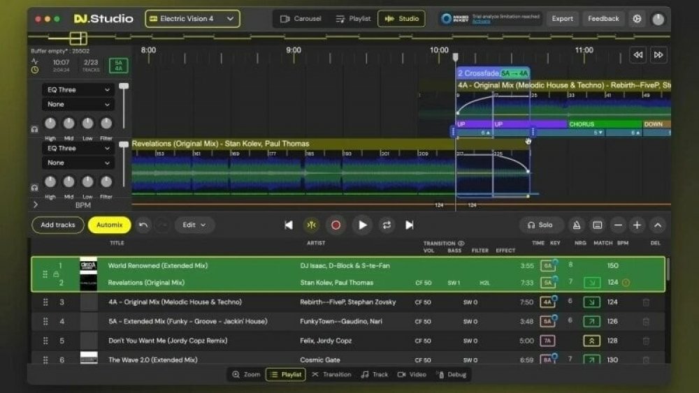 Zlepšite svoj pracovný postup pomocou DAW na DJ mixovanie. Vytvárajte bezchybné dídžejské mixy na svojom notebooku v rekordne krátkom čase pomocou jedinečných, intuitívnych nástrojov a editora založeného na časovej osi. Prispôsobte si prechody a experimentujte s efektmi, aby ste zvýšili úroveň svojho mixu.Pripojte sa k svojej hudobnej, automatizujte na svoju zoznam knižnicu, zamerajte sa na prechody a voilá, ste pripravený na export do svojej obľúbenej platformy.V tomto mixe pre DJov vytvoríte svoje mixy pomocou niekoľkých jednoduchých krokovPomocou miliónov kusov dokonale zoradí váš zoznam podľa Automixu na základe tempa a harmonického zladenia inšpirovaného kolesom Camelot Wheel. Ušetrite obrovské množstvo času a zabezpečte, aby váš DJ mixoval vždy... dokonale.Vyberte si skladby a DJ.Studio sa postará o zvyšok. Pomocou BPM, tóniny a energie zakaždým vytvoríte dokonalý mix.Vyleštite svoje DJské zručnosti, upravte dĺžku skladby, prechody a tempo. Posúvajte hranice a zároveň vždy bezchybne mixujte.Problémy s prispôsobeným tempom a tóniny vyriešite jediným jediným, čím dosiahnete bezproblémové a profesionálne mixy.S modulom Mixed In Key získate funkciu Automix na steroidoch, ktorá vám umožní mixovať s úrovňami energie a cue pointami.Implementujte prechody na miešanie našich jedinečných automatizácií a vytvorte svoj charakteristický zvuk pomocou 14 predných efektov a vlastných jedinečných automatizácií.Kombinujte a prispôsobujte automatizáciu pomocou editora prechodov v aplikácii DJ.StudioPridajte do svojich prechodov viacero efektov naraz. Osloboďte sa od starších obmedzení DJ mixu.Vytvorte si a upravte prechod s vlastnými presnými nastaveniami a efektmi. Máte to pod kontrolou.Pridajte do svojho mixu vizualizácie, aby ste ich mohli exportovať ako MP4, ktoré si môžete nahrať na YouTube.Vyberte si skladby pomocou bezproblémovej integrácie s aplikáciami Mixed In Key, rekordbox, Serato, VirtualDJ, Engine DJ, TRAKTOR, iTunes alebo knižnicou vášho počítača. Exportujte mixy do aplikácií Ableton Live. Čoskoro pribudne: pridávanie vzoriek, používanie VST tretích strán, prekrývanie vokálnych nahrávok a ďalšie možnosti. Máte nekonečný potenciál pre mixovanie, produkciu, podcasty a video.Medzi funkcie hlavné verzie DJ.Studio Pro patria:Manuálne prechody na uvoľnenie kreativityPridávanie pokročilých automatizáciíExport videí vo vysokom rozlíšení (vrátane YouTube)Prehrávač bez značiek YoutubeExport do WAV pre vysokú kvalitu hudbyUkážková skladba (beta)Práca v režime offline (už čoskoro)Presuňte a pustite skladby z vašich knižnícAutomatický mix zoznamov na základe tóniny a BPMVytváranie toku pomocou prednastavených prechodovExport videa v nízkom rozlíšení (vrátane YouTube)Export do MP3, Mixcloud a DJSet
