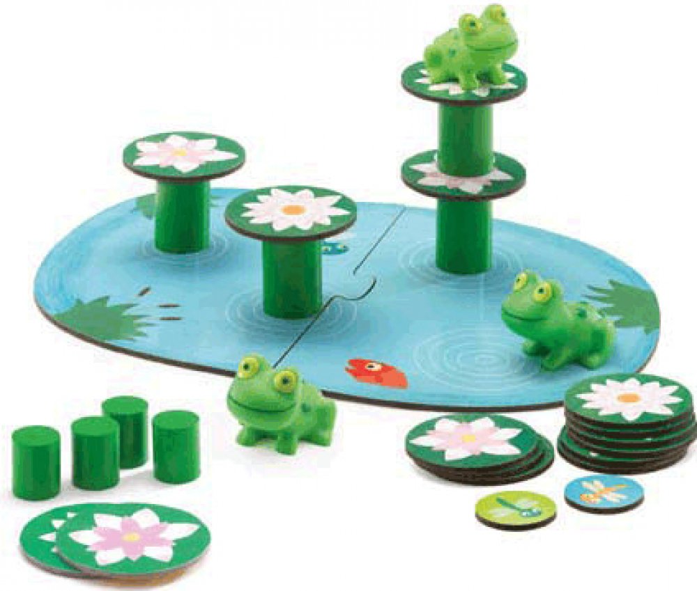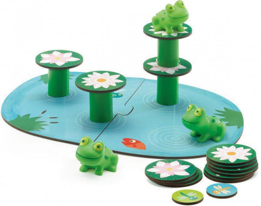 Malé žabky balancují na květech leknínů, které rostou na hladině rybníčku. Musí být velmi opatrné, aby nespadly do rybníčku. Děti nejprve musí postavit sloupky na správné místo a pak na ně klást květy leknínů. Teprve následně mohou na leknín naskočit žabky. Ale pozor! Jakmile spadne jenom jediný dílek, celá hra začíná znovu. Hru lze jednoruše upravovat podle věku a šikovnosti dětí.