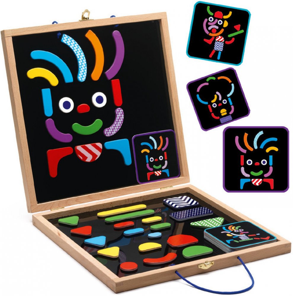 Barevné magnetky Veselé obličeje. Děti můžou vytvářet barevné kombinace dle předloh nebo dle vlastní fantazie. Hravé barevné tvoření rozvíjí představivost o geometrických tvarech a matematické uvažování. Vše zabaleno v praktickém dřevěném kufříku. Kufřík obsahující 35 magnetických geometrických tvarů a 20 karet s předlohou.