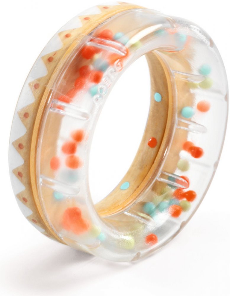 Djeco Chrastítko kroužek je dřevěný kruh, který vydává zvuky podobné dešti. Dítě kroužkem otáčí a třese, aby vidělo, jak se v něm kutálejí barevné kuličky a vydávají uklidňující zvuky deště. Chrastítko lze také omotat kolem ruky jako náramek, takže hraní je ještě zábavnější. Průhledné prvky umožňují sledovat pohyb barevných kuliček uvnitř a upoutat tak pozornost dítěte.
