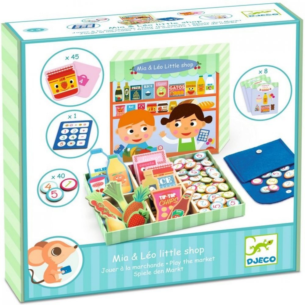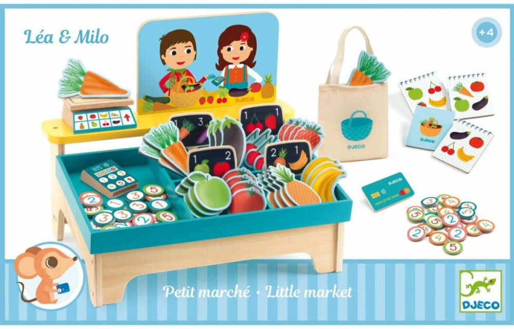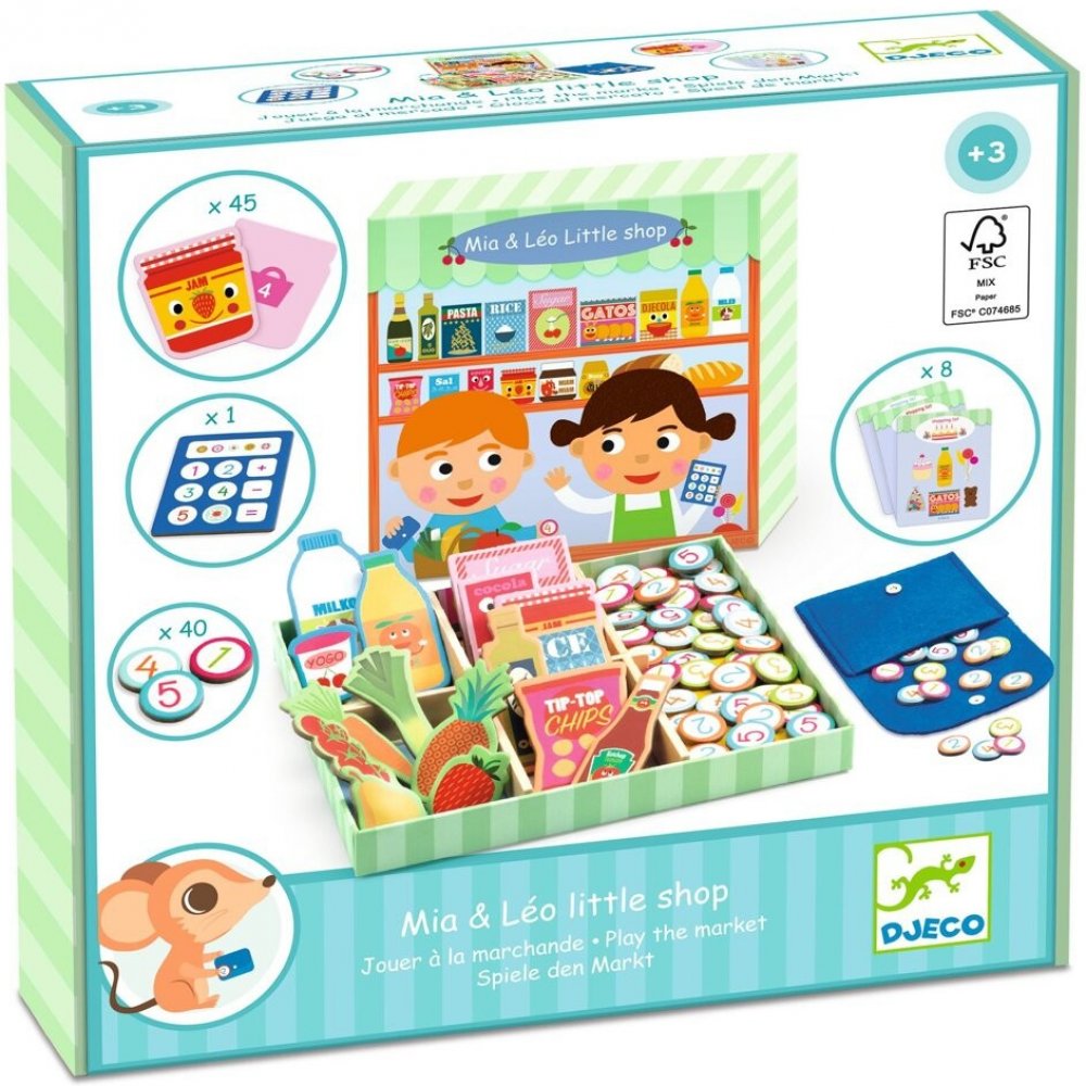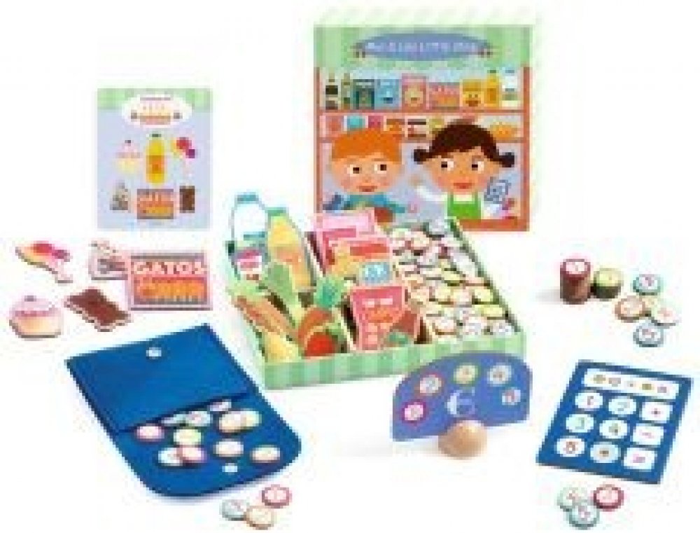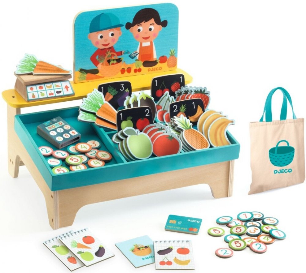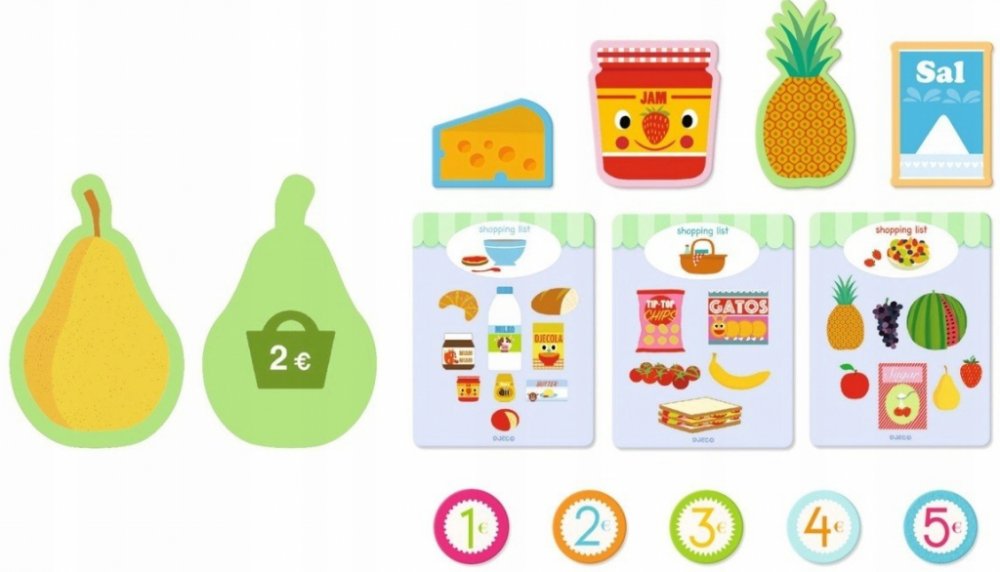 Obsah: 45 potravin z karty, 40 mincí z karty, 1 oboustranný panel a 1 dřevěný podstavec, 1 kalkulačka z karty, 8 karet s nákupním seznamem a 1 plstěná peněženka s 1 magnetickou sponou