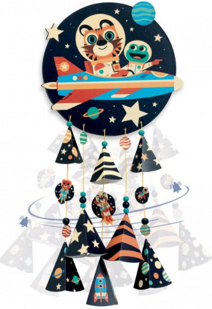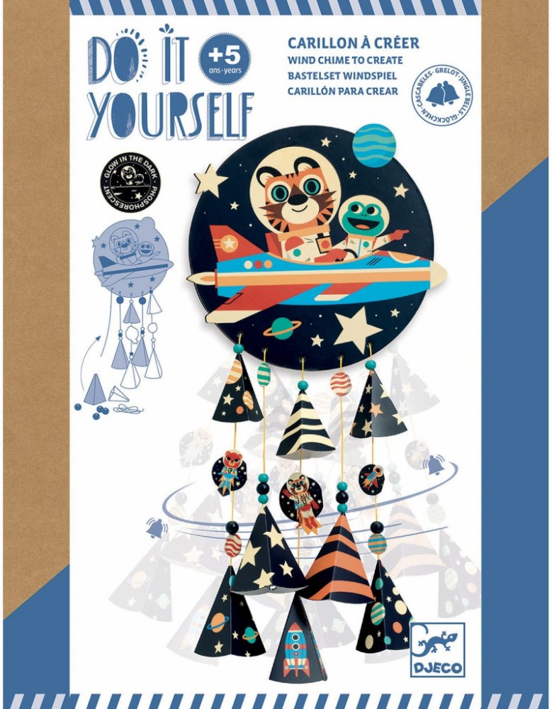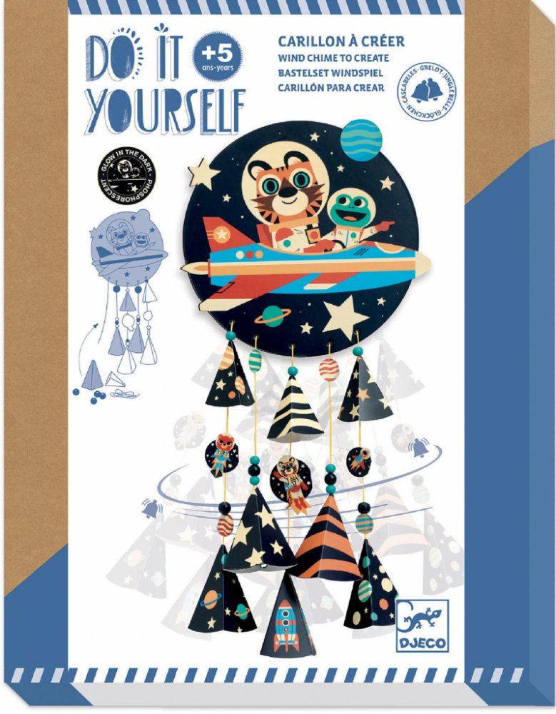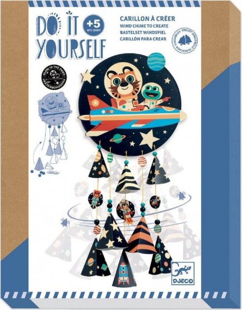 Kreativní sada pro děti od 5 let. Pomocí komponentů si děti sestaví vesmírnou zvonkohru. Děti budou hrdé na to, že se jejich tvorba proměnila na krásný dekorativní předmět. Na základ zvonkohry si děti pomocí voskovaných bavlněných nití připevní zvonky, papírové kužely a dřevěné korálky. Zavěšená zvonkohra příjemně zvoní a svítí ve tmě. Krabička obsahuje 8 kuželů, dřevěné korálky, voskované bavlněn...