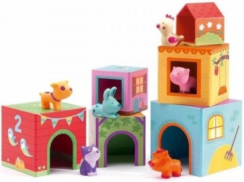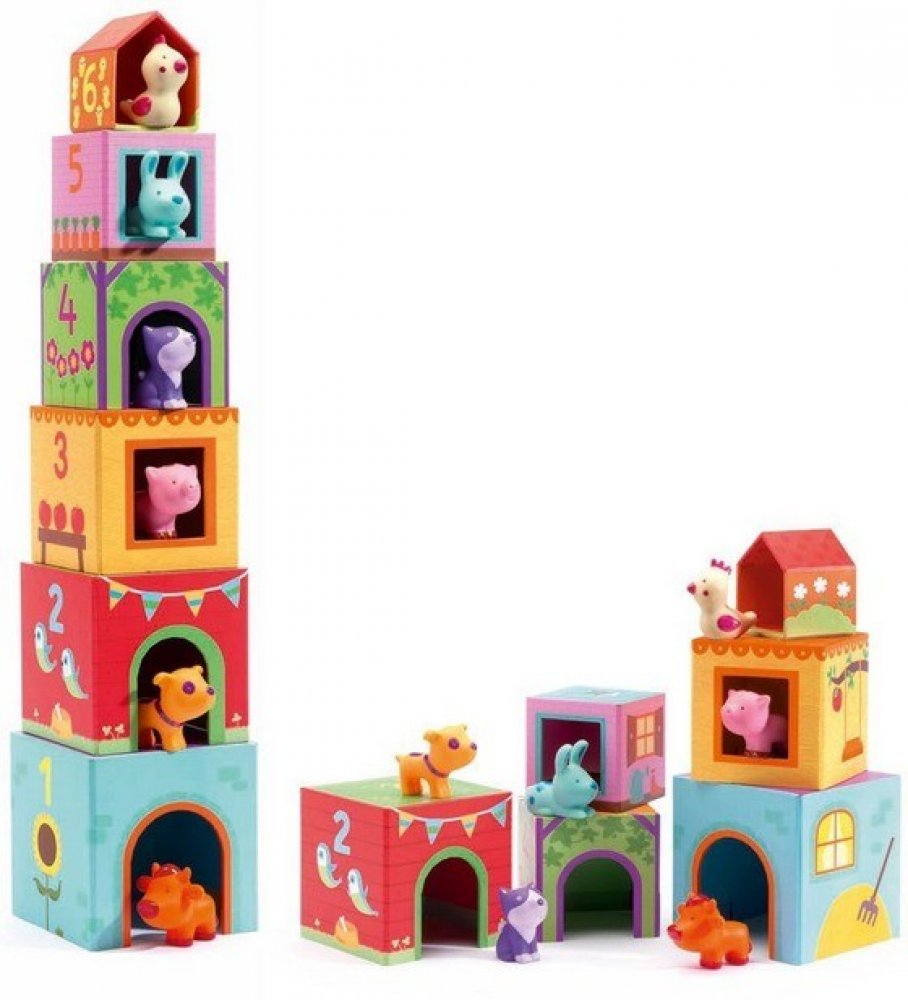 Stohovací kostky DJECO se zvířátky a jejich příbytky nabízí mnoho způsobů hraní. Z kostek lze stavět věž nebo řada, vkládat je do sebe od největšího k nejmenšímu a naopak.