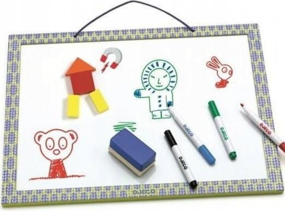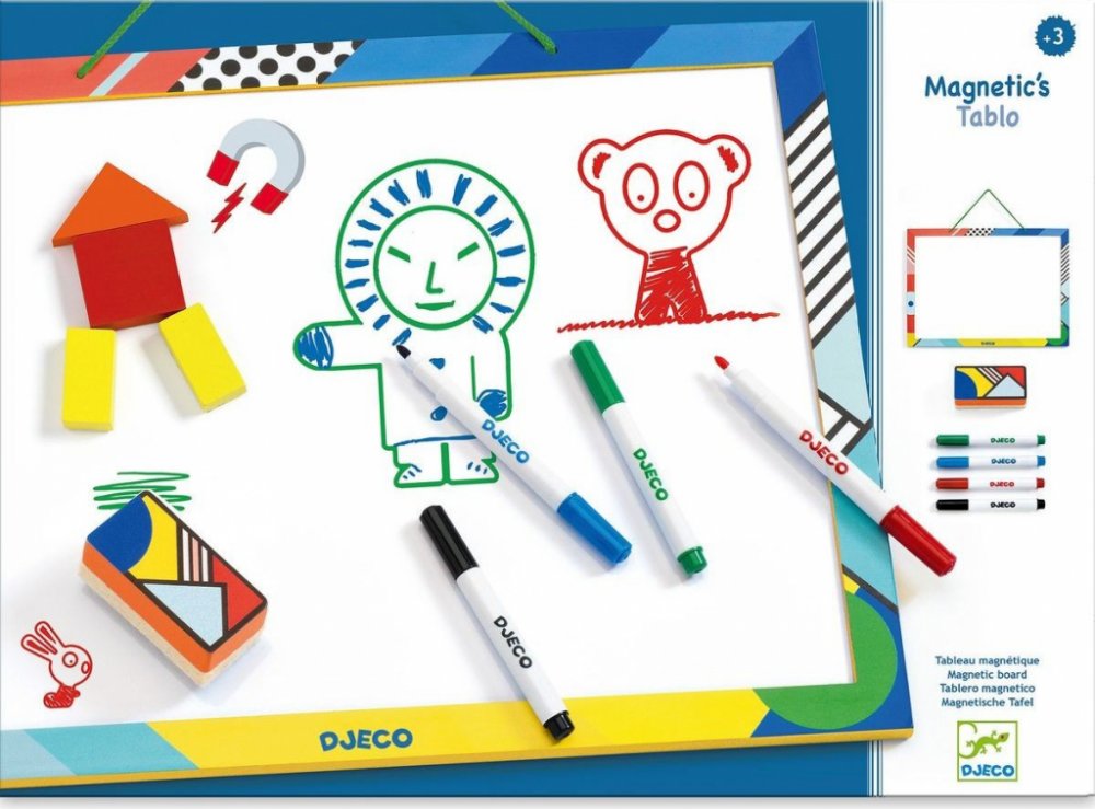 Magnetická a kreslicí tabule je vhodná jak pro umístění magnetků a tvoření příběhů s nimi, tak pro samotné kreslení (fixy a houbička jsou součástí balení). Ideální je spojit obojí dohromady a vytvořit úžasnou scenérii z oblíbených magnetků doplněnou o kresby okolí.