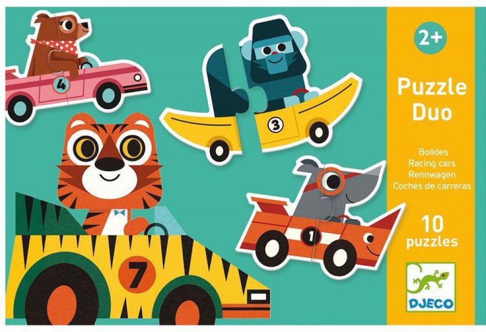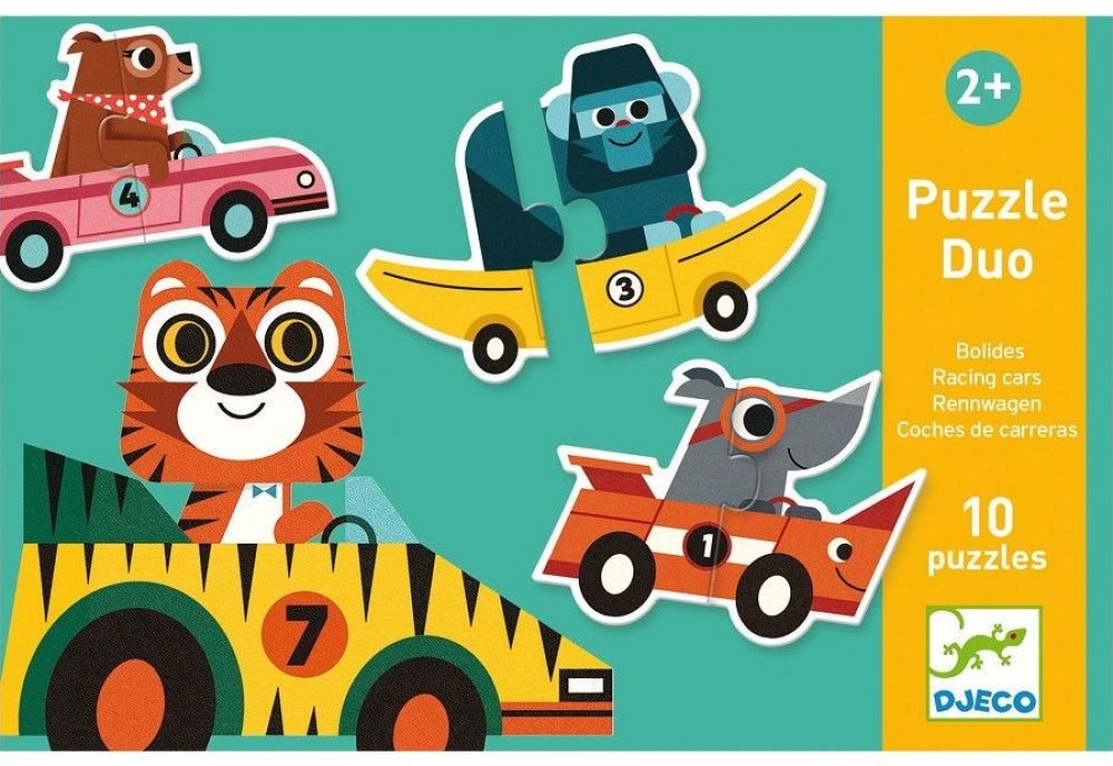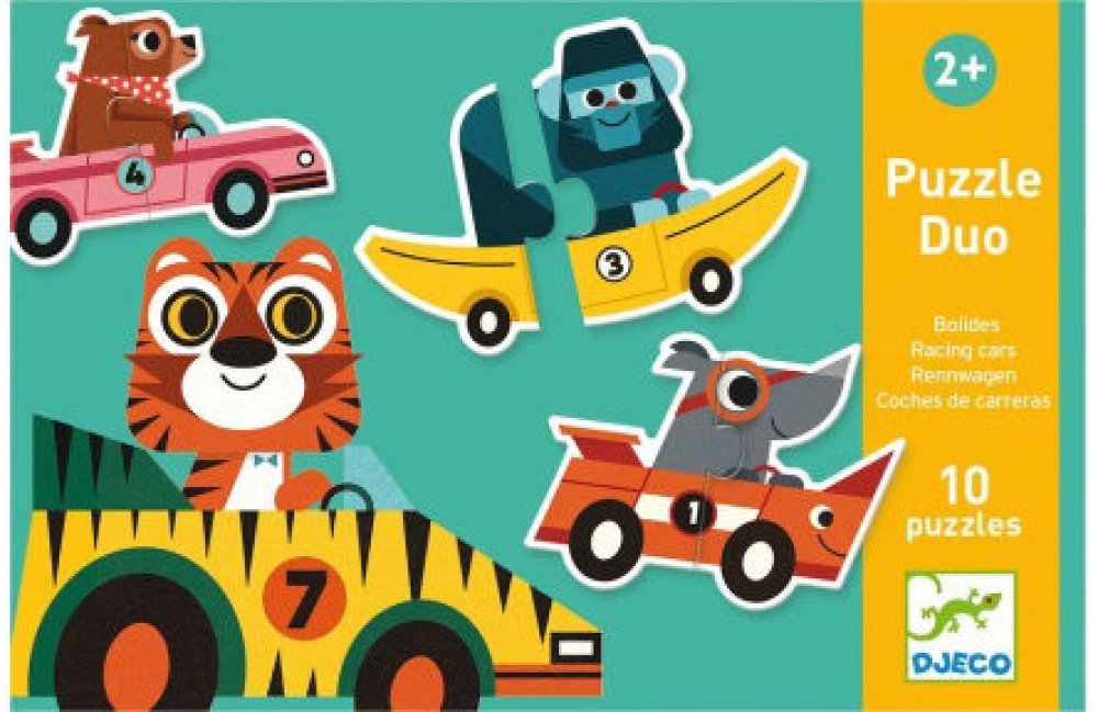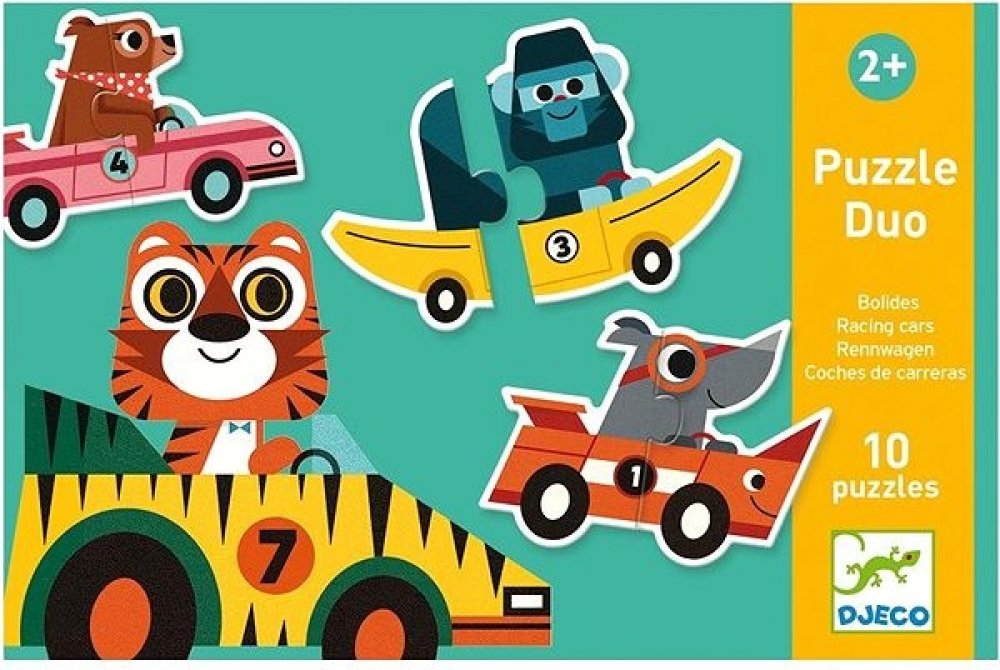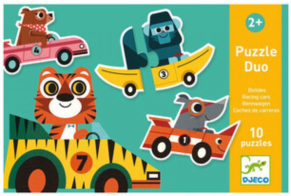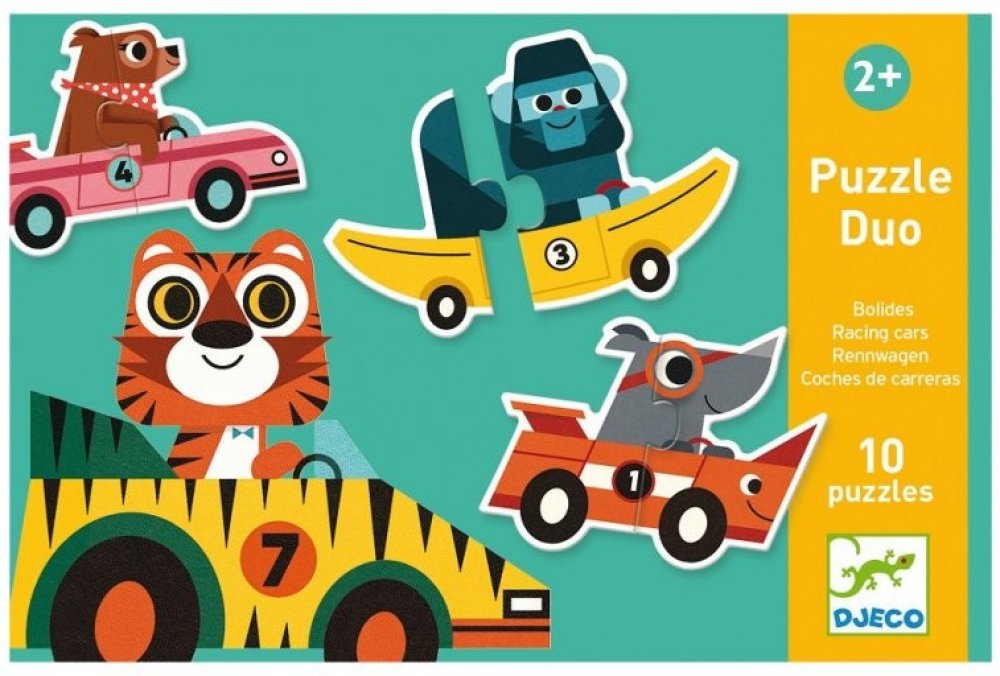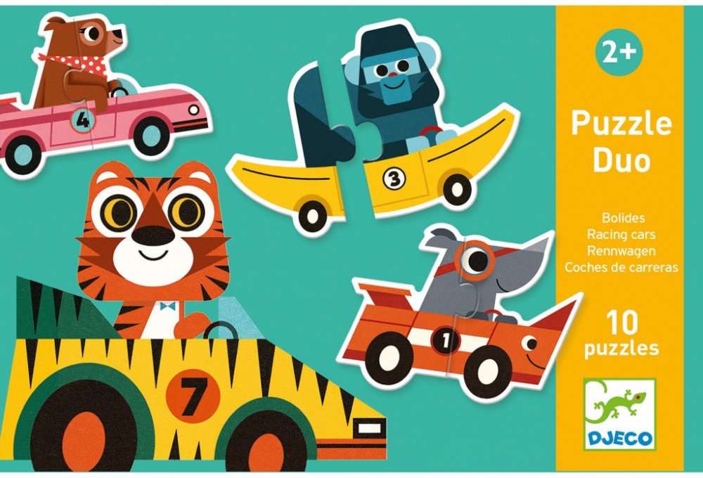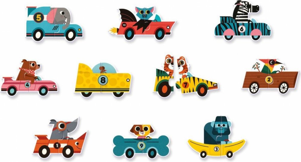 Puzzle pro nejmenší děti: ze dvou dílků složíte závodní auta. Je úžasné, že auto vždycky nějak odpovídá závodníkovi - pejsek závodí v kosti, gorila v banánu, auto nosorožce má nádherný roh, a tad dále. No schválně - co vám připomíná auto, v němž si to trandí myška?