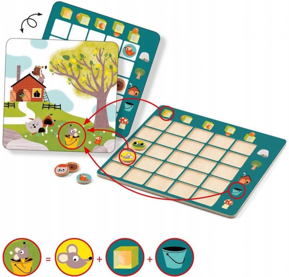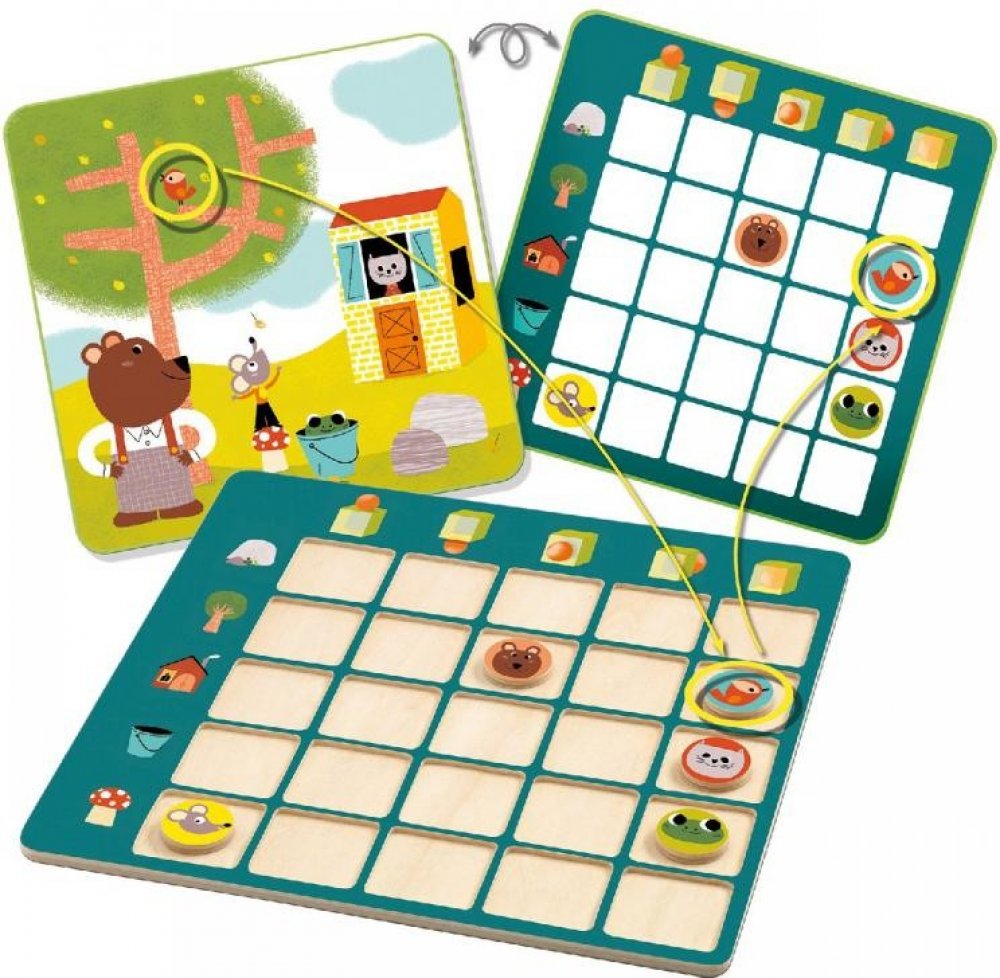 Kde je žába? Kde je pták? Na stromě, nahoře. Úkolem dětí je určit polohu všech pěti zvírat a rozmísti jejich žetony správně do herní mřížky. Velmi zábavná a poučná hra, která učí děti vyznat se v prostoru a určit kde je vpředu, vzadu, nahoře, dole nebo uprostřed.