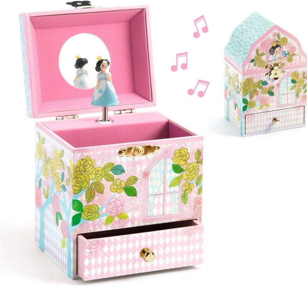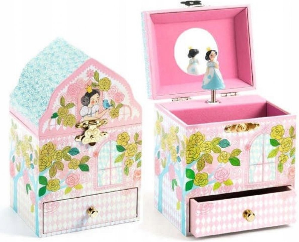 Krásná hrací skříňka ve tvaru kouzelného zámku s motivem princezny. Skříňka slouží současně jako šperkovnice nebo skrýš na poklady. Po otevření víčka se z krabičky line příjemná melodie a princezna se začne točit.