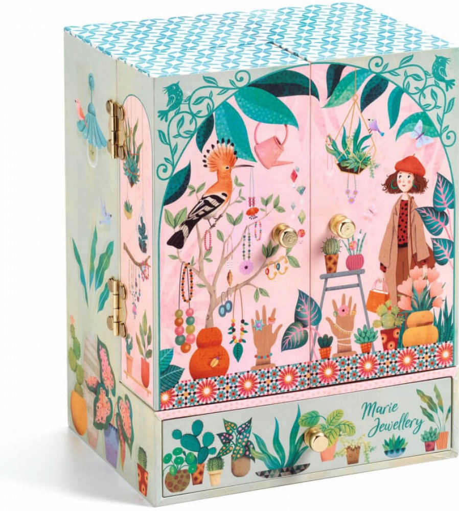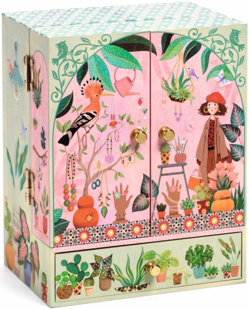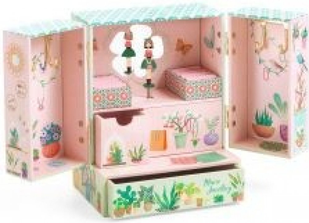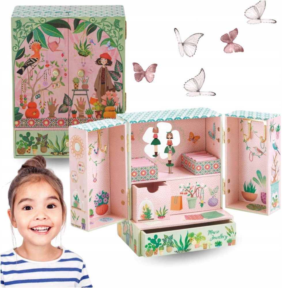 Krásná šperkovnice a hrací skříňka v jednom je sen každé malé parádnice. Otevřete dveře a překvapí vás krásný interiér šperkovnice. Uvnitř skříňky je jedna velká a jedna malá zásuvka pro uložení šperků a tajemství. Praktické jsou i háčky na prstýnky a na zavěšení náhrdelníků a náramků. Přihrádky jsou vystlané měkkým sametem. Otočte klikou a otevřete tuto nádhernou krabičku. Ta rázem ožije. Krásná ...