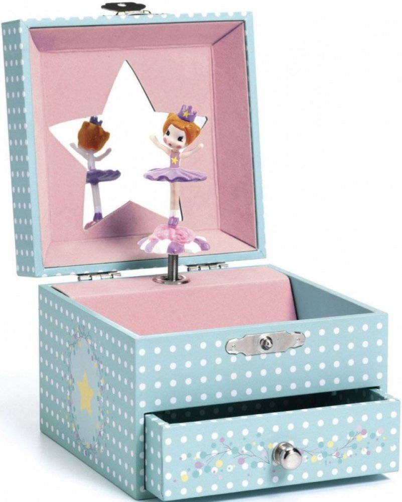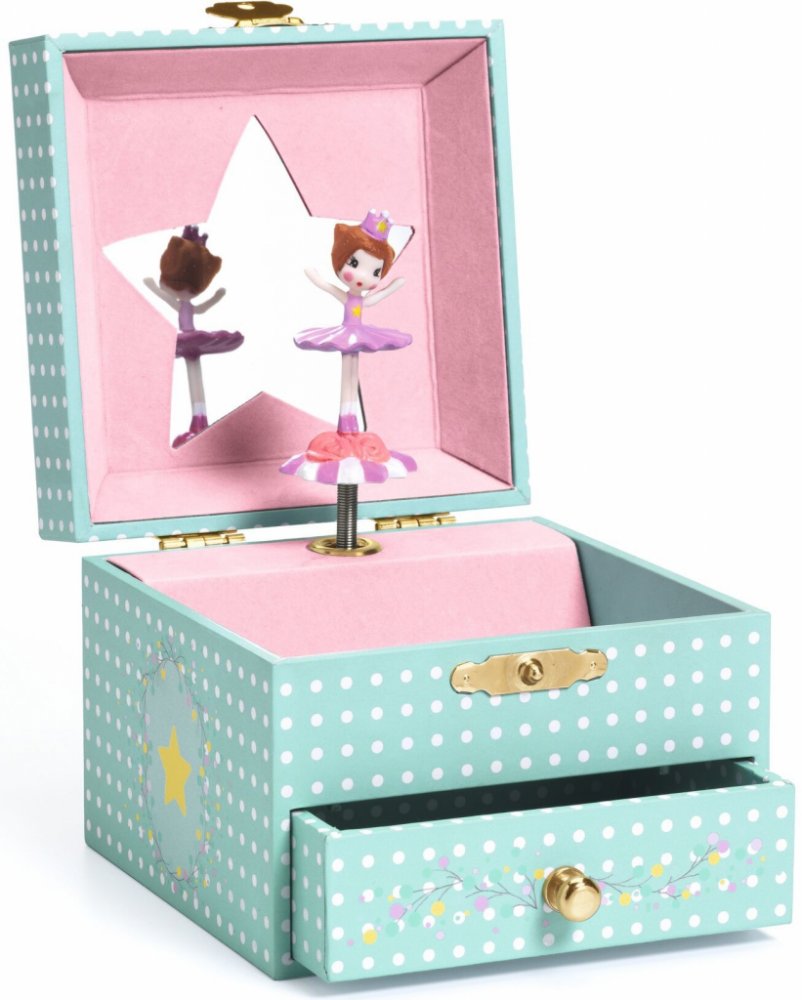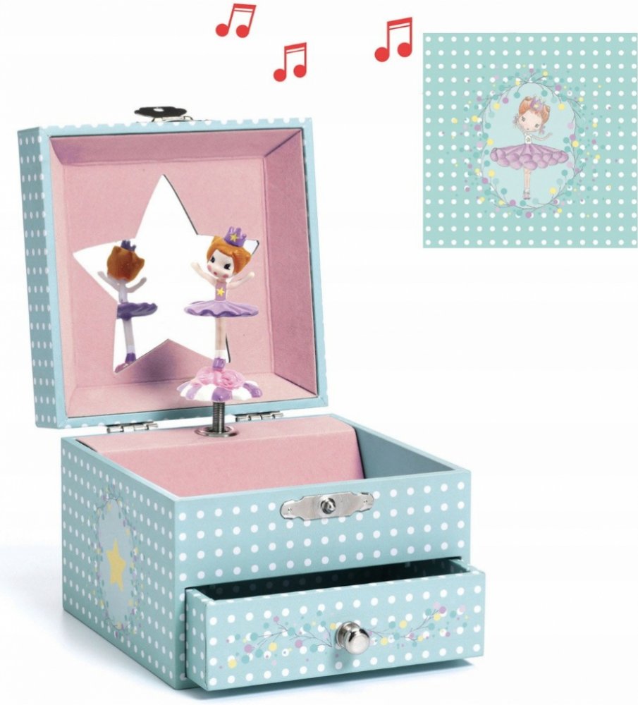 Krásně ilustrovaná hudební skříňka se zásuvkou pro uložení šperků a tajemství. Otočte klikou, otevřete krabici a nechte se překvapit! Jemně tvarovaná baletka se otáčí a vrhá svůj odraz v zrcadle při hudbě „Pozvánka k tanci“ Carla Maria von Webera.