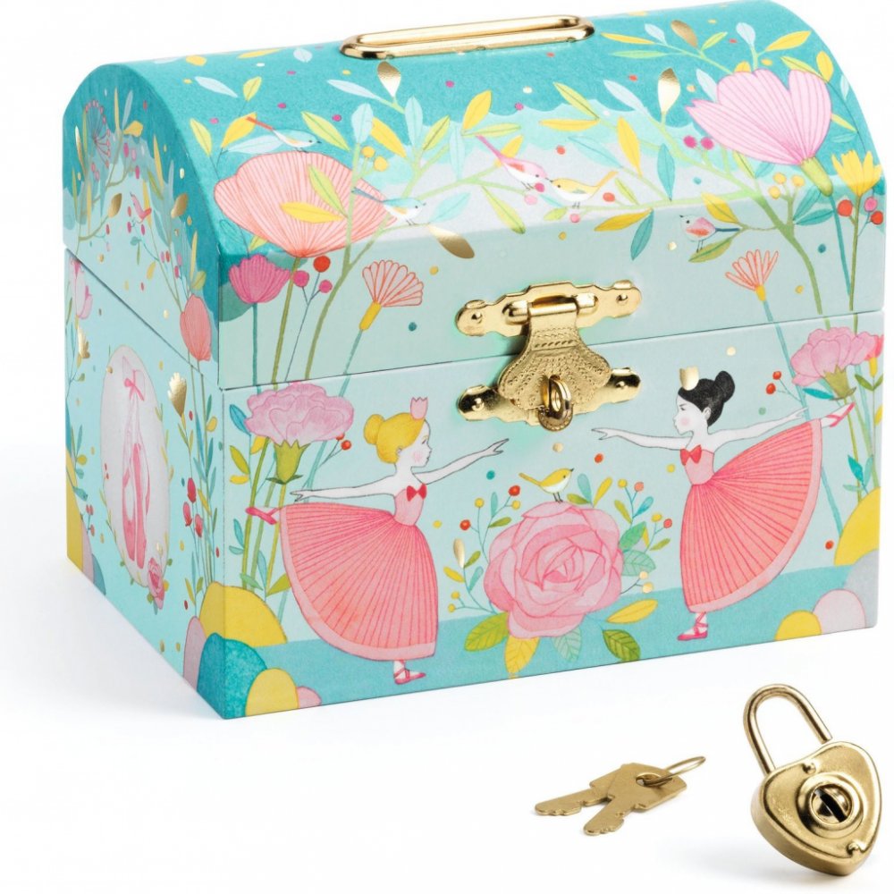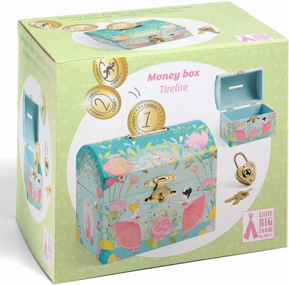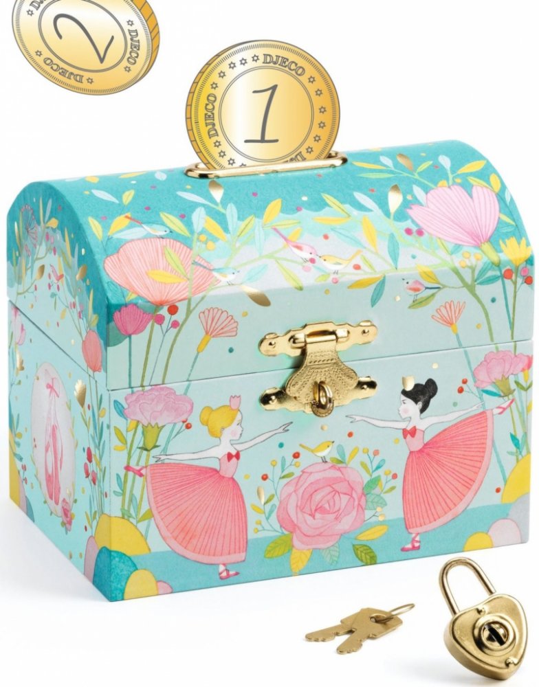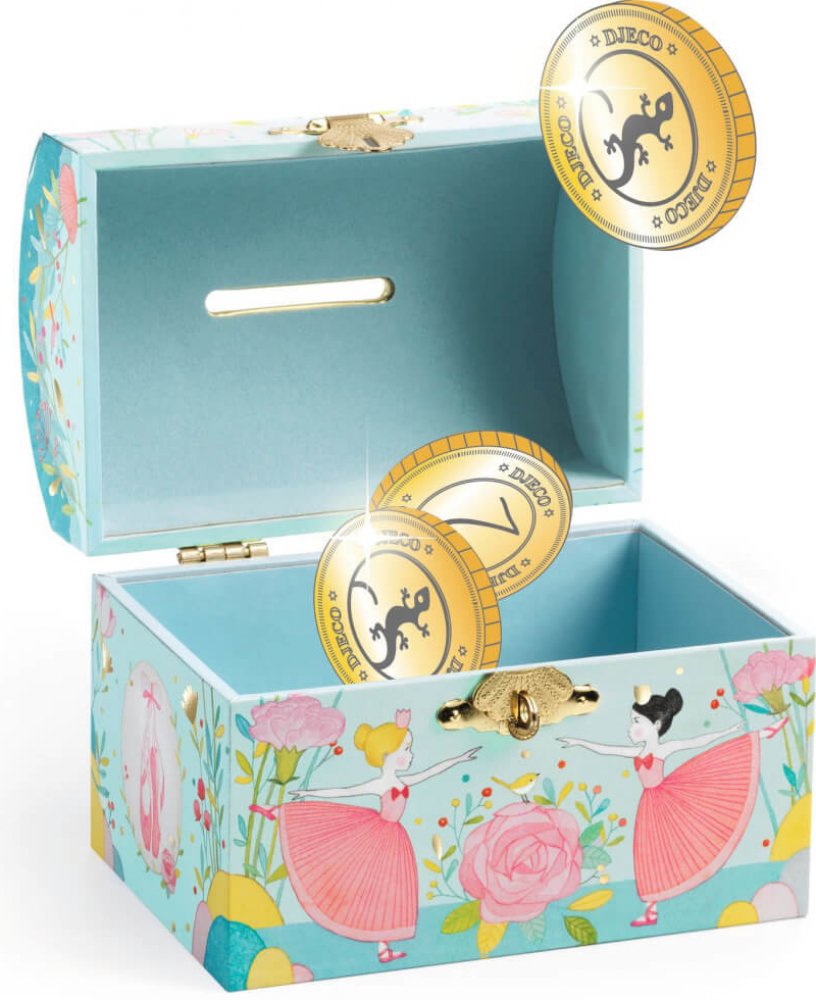 Dřevěná pokladnička ve tvaru truhličky pro úspory i pokladíky. Ilustrovaná hravým motivem baletek je perfektním doplňkem dětského pokoje. Otvor pro vhazování mincí je chráněn kovovou obrubou. Dno truhličky je pokryto sametovým potahem. Zamyká se na lehký kovový visací zámek. Obsahuje 2 klíčky.Vlastní úspory podporují finanční gramotnost a jsou dalším důležitým krokem na cestě k samostatnosti.Rozměry: 12 x 10 x 8,2 cm.Rozměry balení: 11,7 x 11,7 x 10,6 cm.