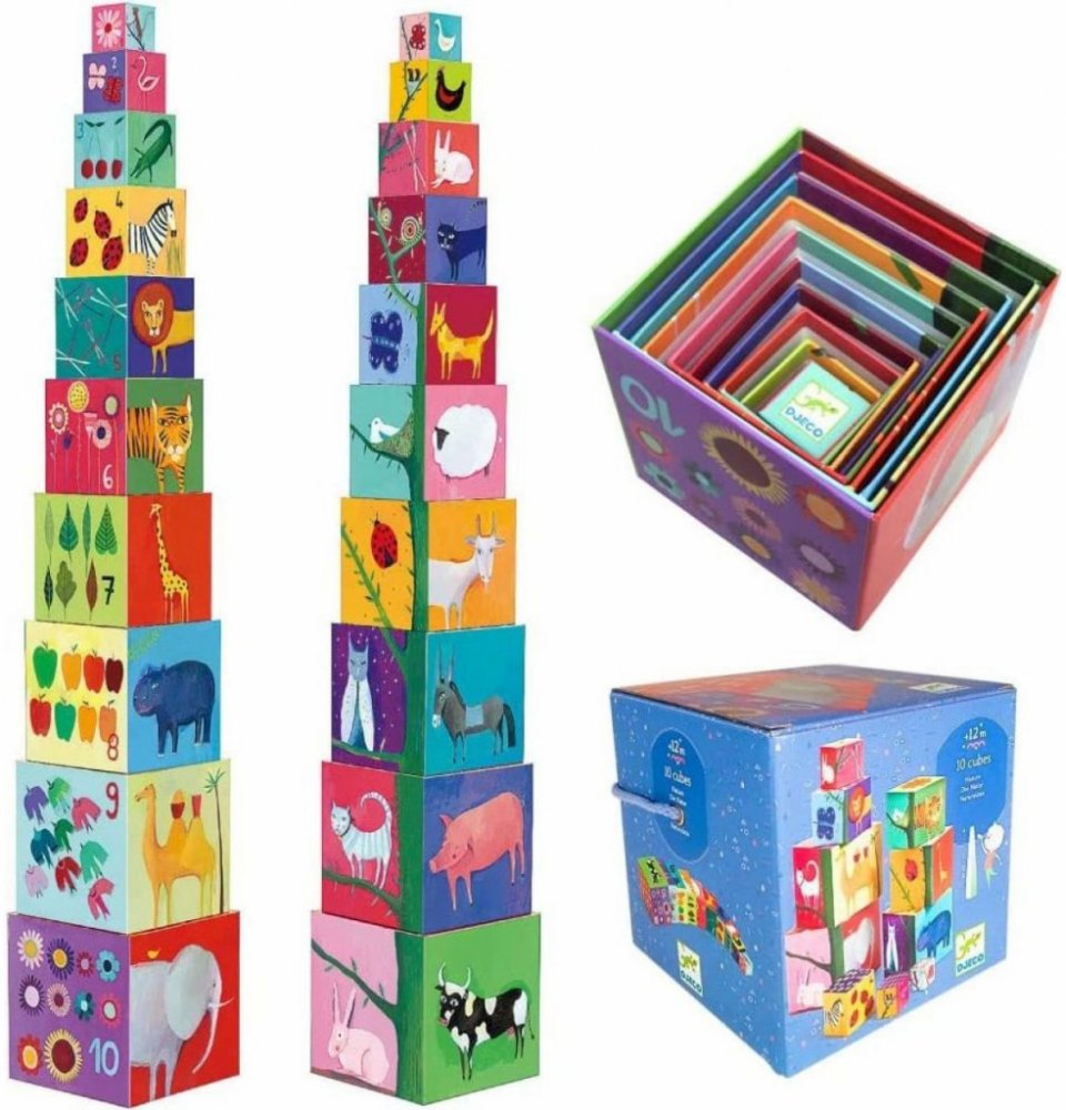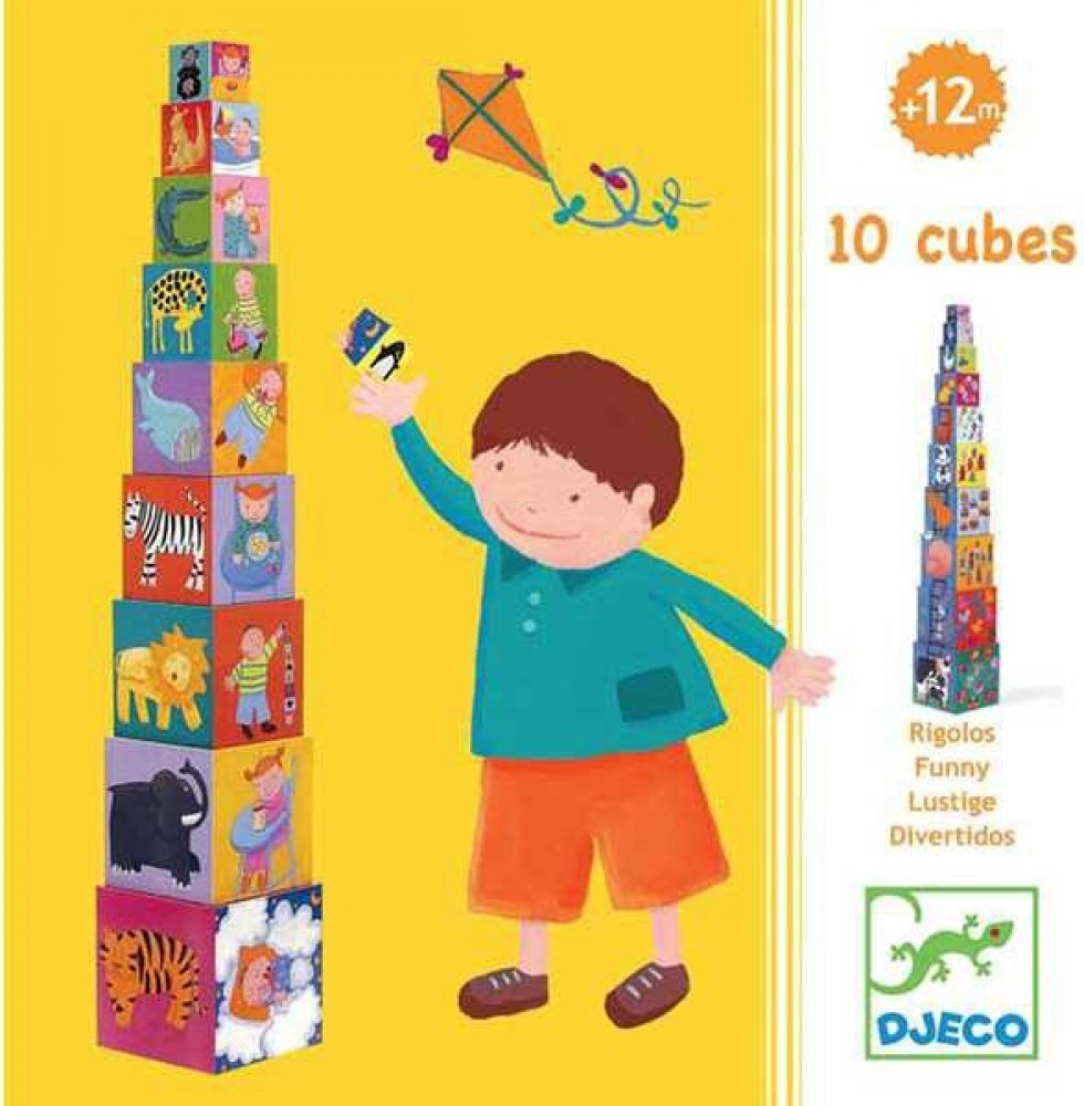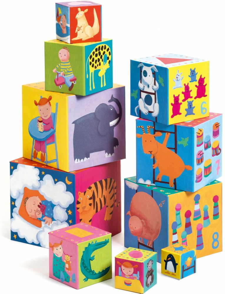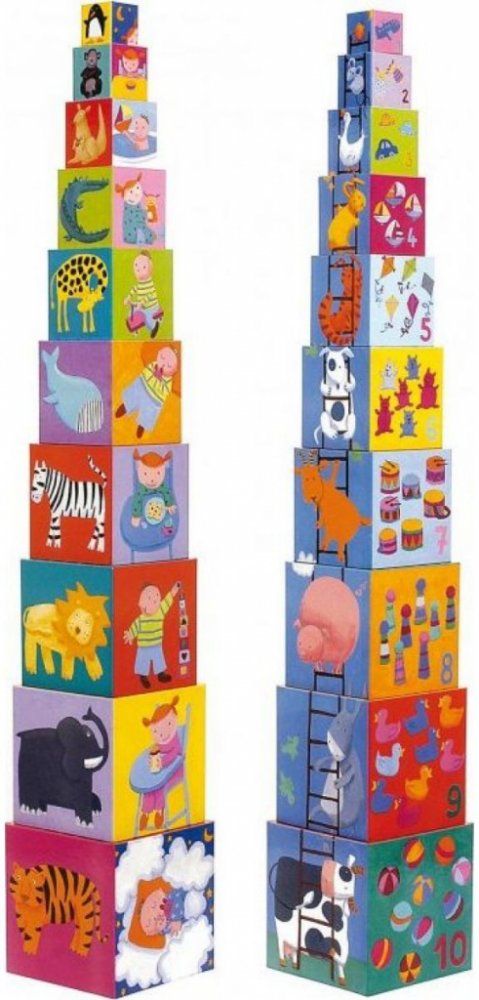 Každá kostka má jinou velikost - lze je složit do sebe, ale také na sebe do tvaru vysokánské věže. Jsou duté, využitelné jako nádobky či úkryt na hračky. Každá strana disponuje barevným obrázkem - některé na sebe na vazují, další učí první počty, jiné vás potěší barevným zvířátkem, autíčkem či postavičkou.
