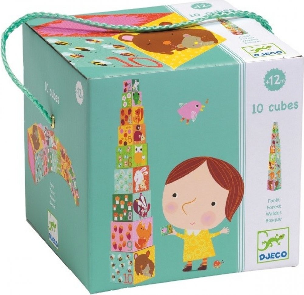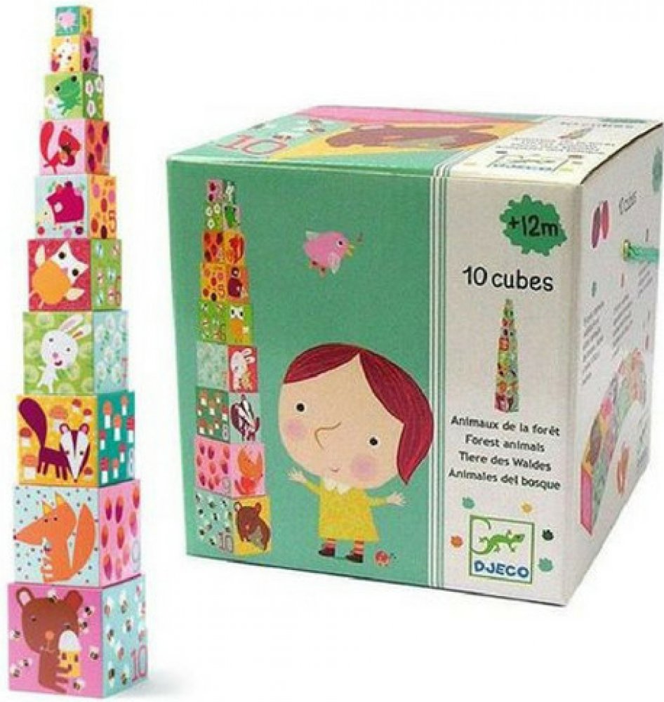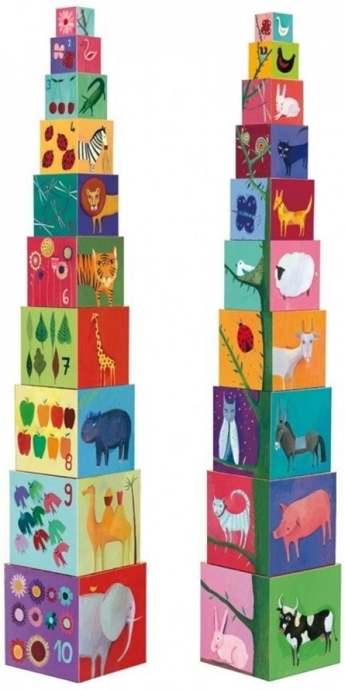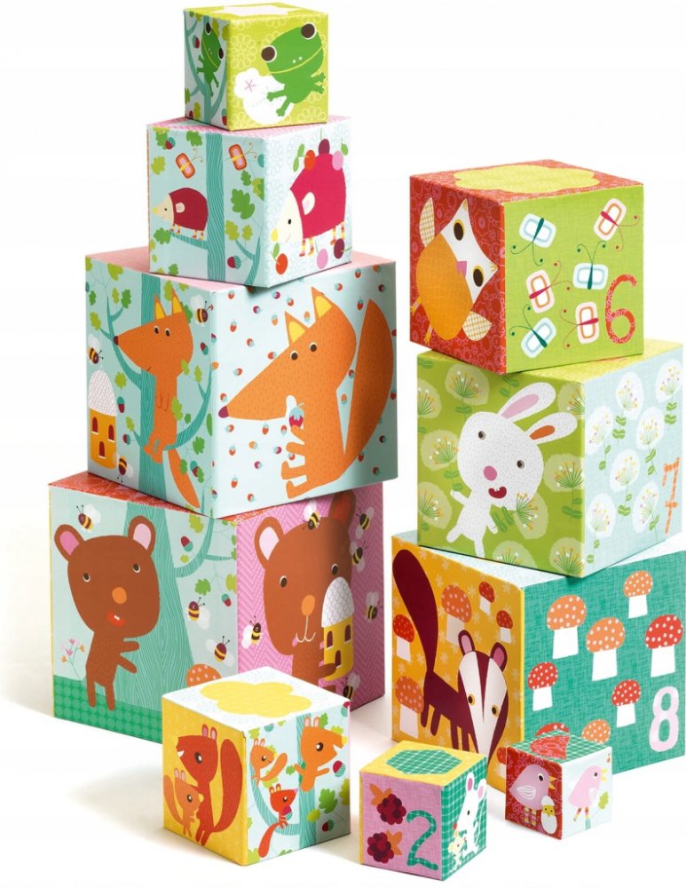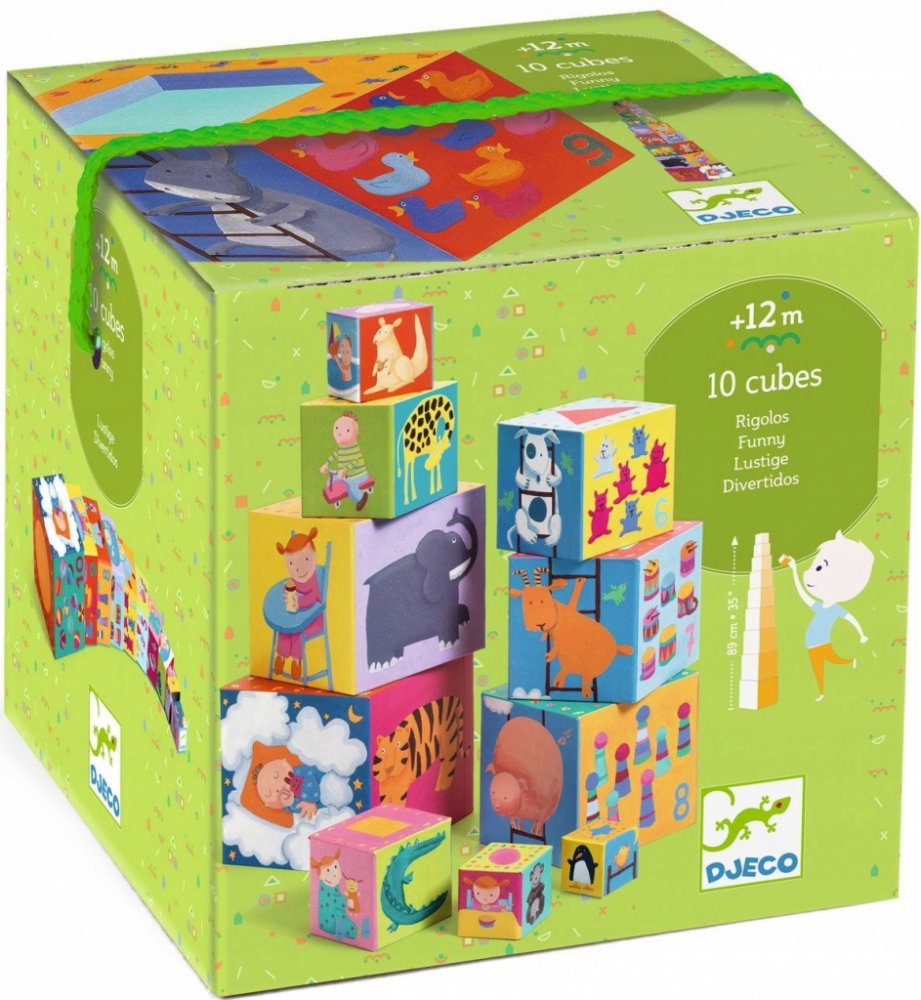 Každá kostka má jinou velikost - lze je složit do sebe, ale také na sebe do tvaru vysokánské věže. Jsou duté, využitelné jako nádobky či úkryt na hračky. Každá strana disponuje barevným obrázkem - některé na sebe na vazují, další učí první počty, jiné vás potěší barevným zvířátkem, autíčkem či postavičkou.
