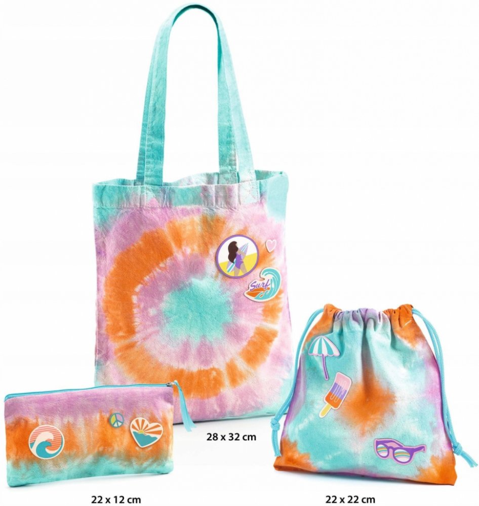 K ozdobení čeká bavlněná taška, batoh a sáček uzavíratelný na zip. Příslušenství lze obarvit několika způsoby: geometrickými vzory, liniemi nebo kruhy. Po vysušení je třeba materiál ozdobit přiloženými žehličkami s prázdninovými vzory.