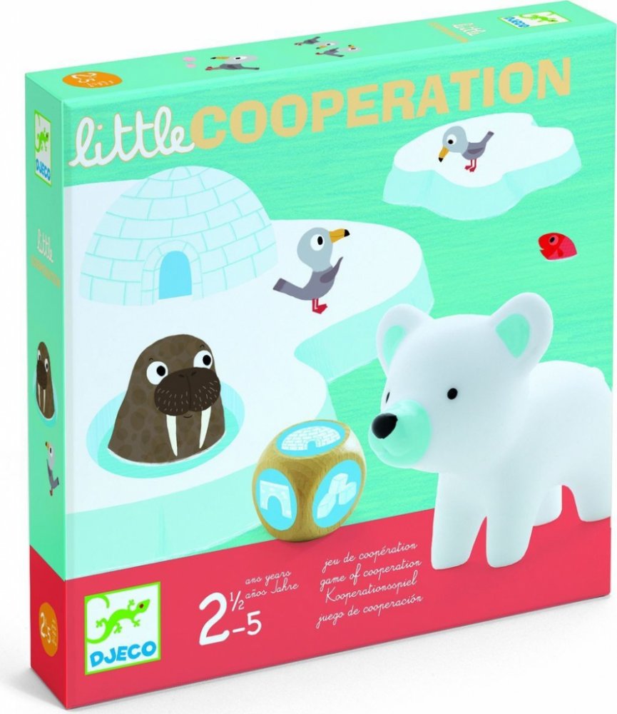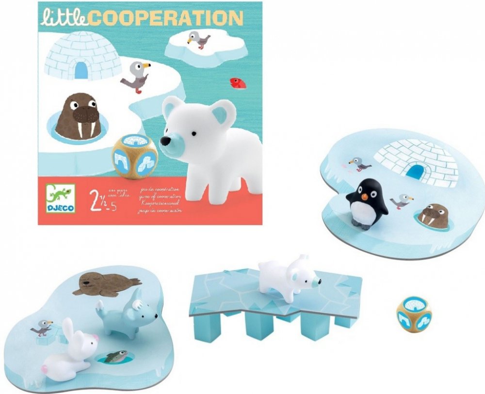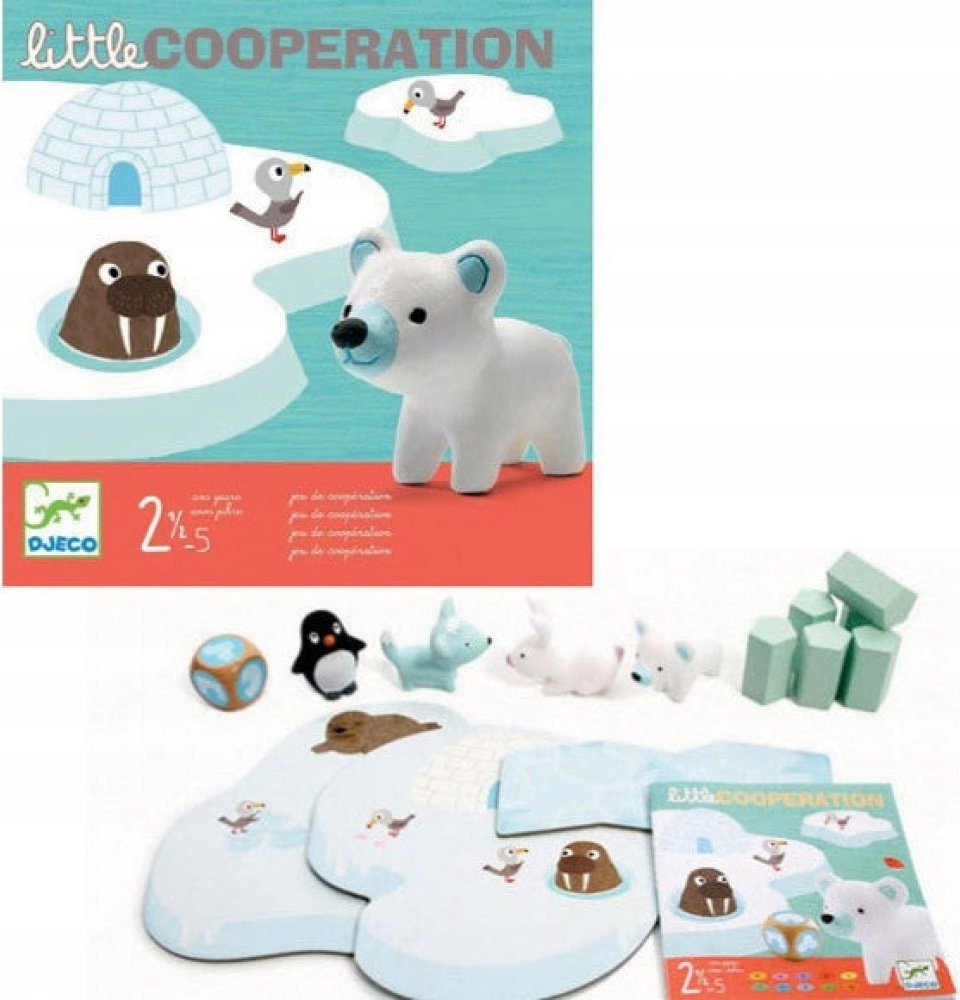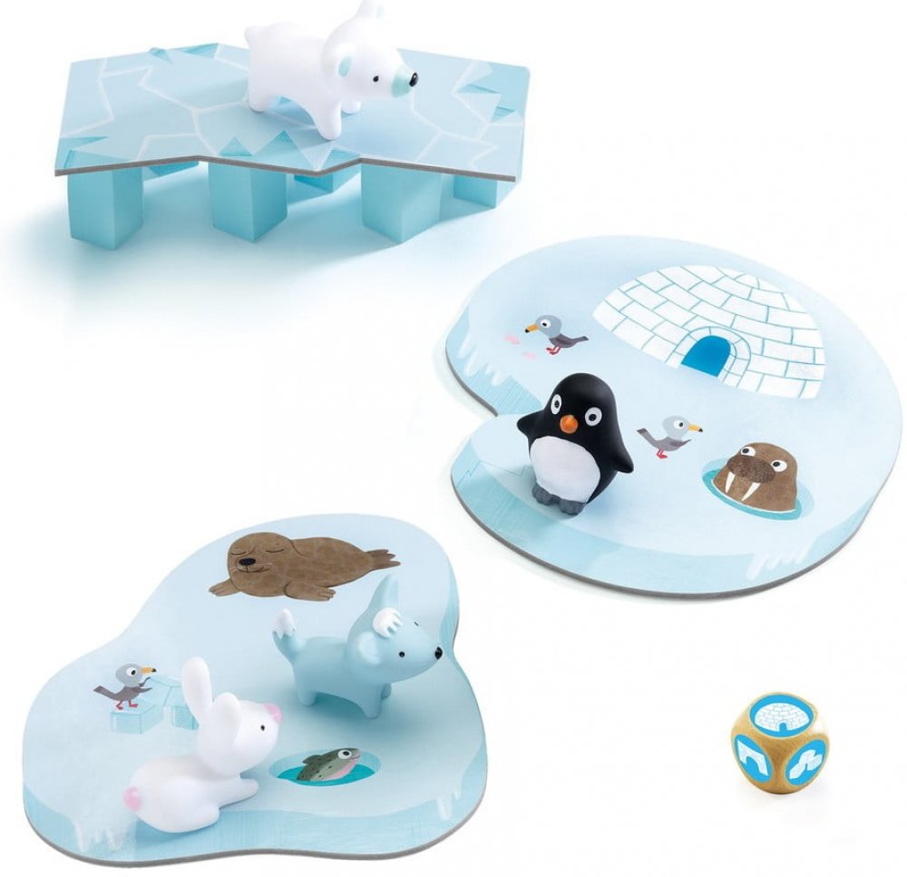 Zábavná jednoduchá hra o cestě po tenkém ledě! Společenská hra – Djeco – Malá spolupráce je vhodná pro děti od 2,5 do 5 let. Severská zvířátka se snaží dostat do iglú. Všichni musí spolupracovat, protože jen tak se dostanou do bezpečí přes slabý ledový most, který se může každou chvíli zhroutit.