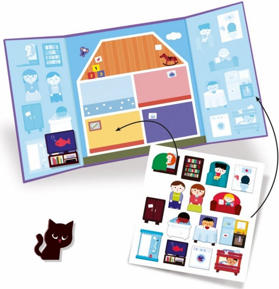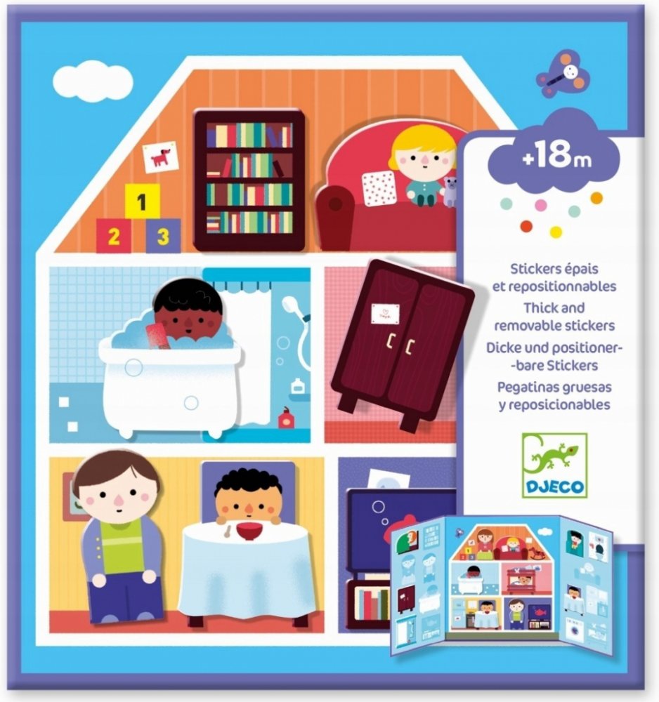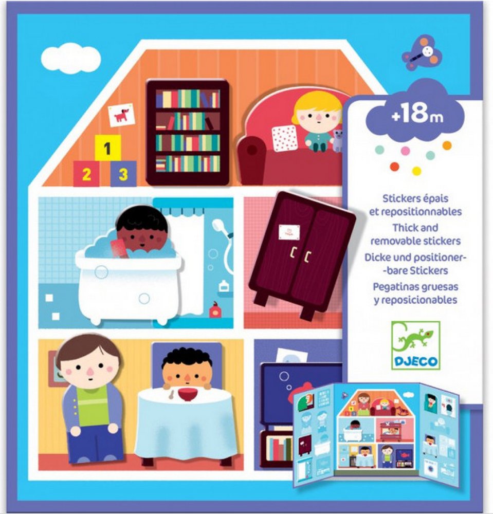 DJECO Přemístitelné samolepky pro nejmenší Domov jsou skvělou zábavou pro děti od 18 měsíců. Tato sada samolepek umožňuje dětem tvořivě si hrát a učit se rozpoznávat tvary a místa.