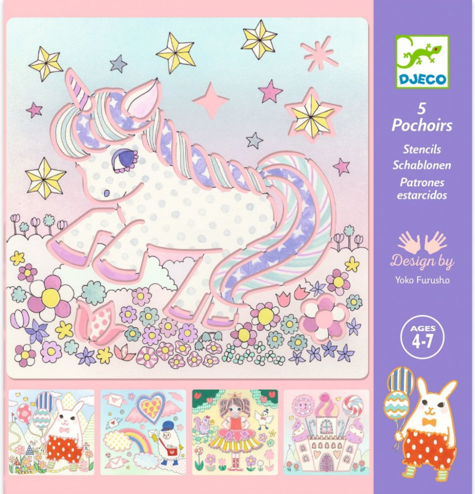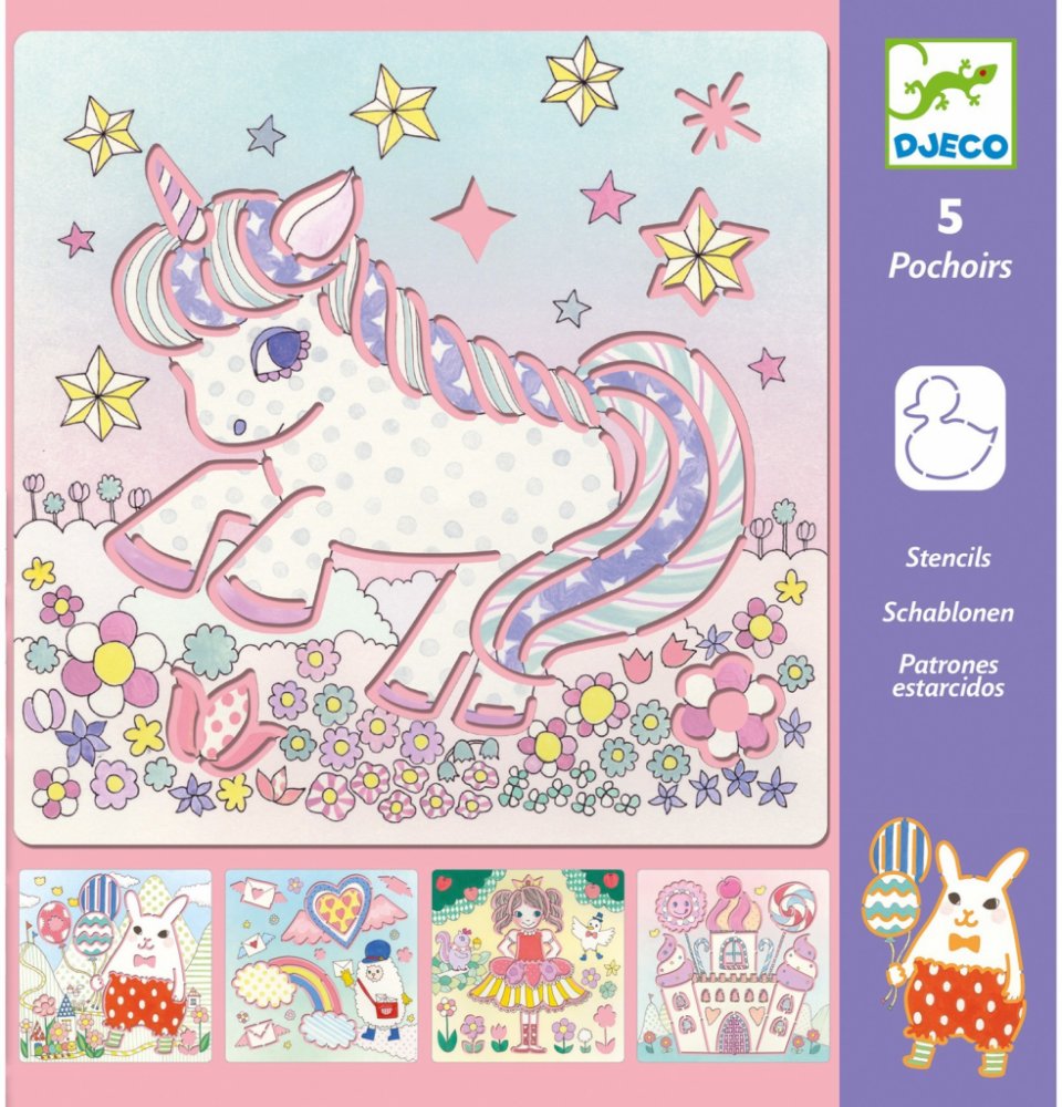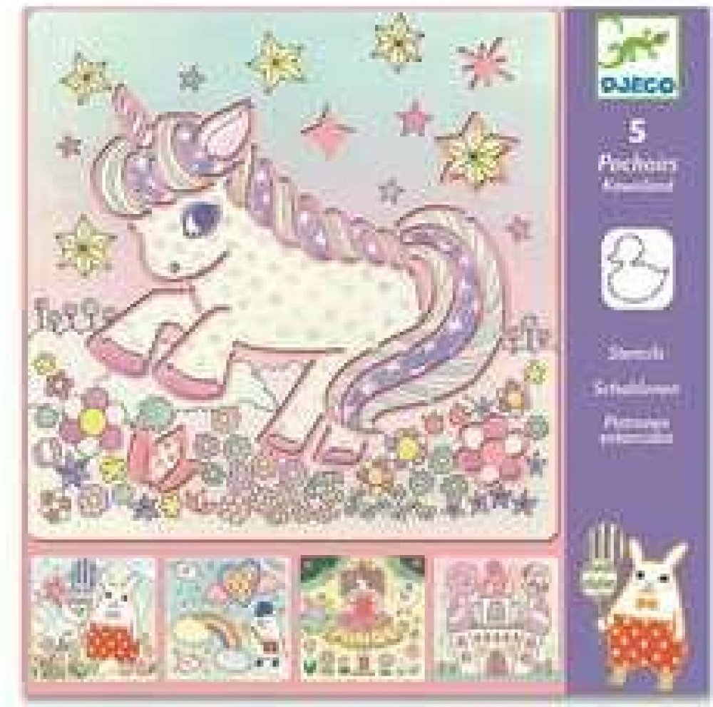 Sada 5 plastových šablon s motivy jednorožců pro snadné tvoření krásných obrázků.