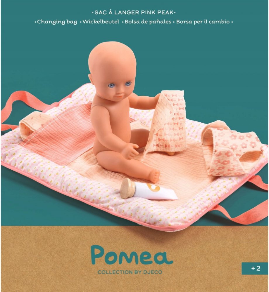 Skládací přebalovací taška z kolekce POMEA je nezbytná pro péči o panenku. Po rozložení se z něj stane měkká podložka, která představuje místo pro výměnu plenky. Po složení vypadá jako kufřík, který si můžete vzít s sebou kamkoli. Uvnitř je kapsa na všechny potřebné doplňky: plenky, kapesníky a krém. Hračka je vhodná pro panenky o rozměrech od 30 do 36 cm.