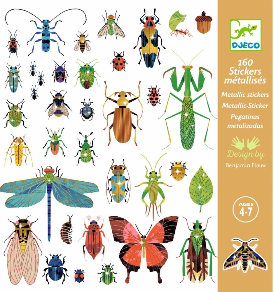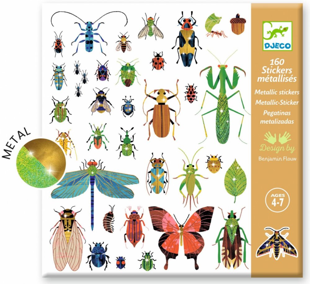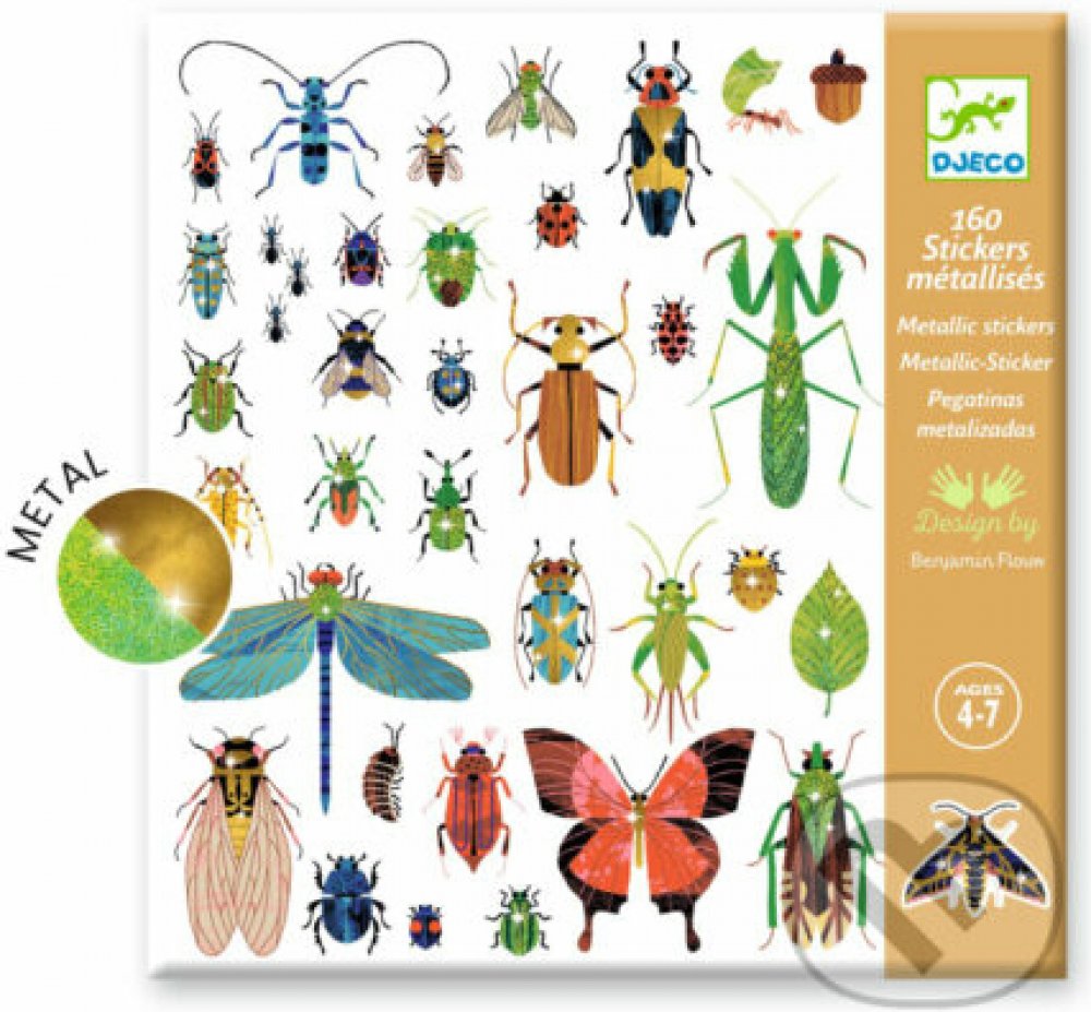 Samolepky s motivem hmyzu. Detailní barevné ilustrace různých brouků i motýlů jsou ozvláštněny zlatým a zeleným metalickým leskem. Samolepky jsou použitelné samostatně nebo jako doplněk kresbiček. Jsou jednorázové, nejsou odlepitelné. Sada je vhodná jako malý dárek.Papír a lepenka použité k výrobě mají ekologický certifikát FSC®.Obsah: 160 samolepek (2 designy x 2 archy, celkem 4 archy).Doporučený věk: 4 - 7 let.Rozměry archů: 20 x 20 cm.Rozměry balení: 21,8 x 23 x 0,3 cm.