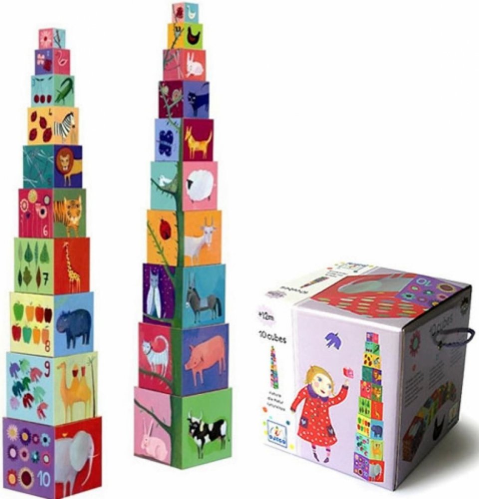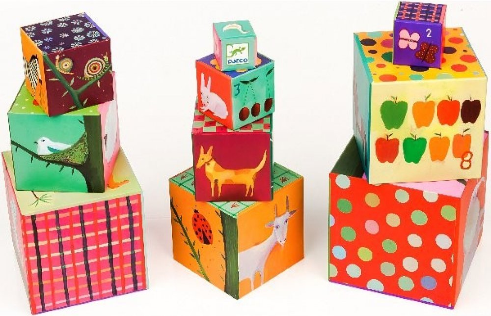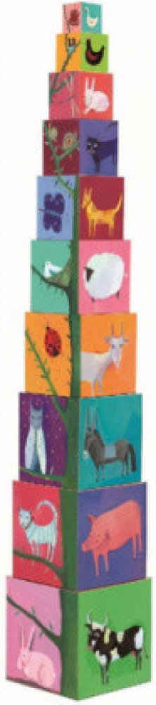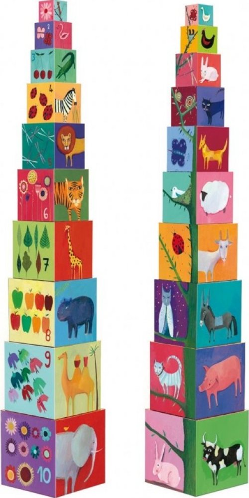 Postavte si krásnou věž s motivy zvířátek a přírody. Kostky můžete stavět na sebe, nebo vkládat do sebe.Na stěnách kostek se může dítě naučit názvy zvířatek, barvy a čísla. Balení obsahuje 10 kostek. Velikost největší kostky 15 x 15 cm. Vyrobeno z tvrdého kartonu. Pro děti od 12 měsíců