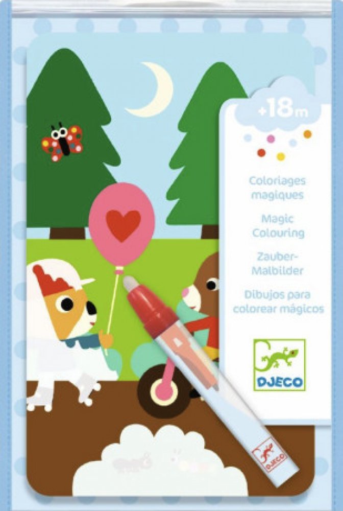 Malování s magickou tužkou s opětovně se odkrývajícími obrázky. Postavičky zvířátek na 4 obrázcích o velikosti 19,5 x 13 cm se objeví až po přetření magickou tužkou. Tužka se před aplikací naplní vodou, která umožní objevení obrázků v pestrobarevných barvách. Krásně barevný obrázek zůstane odkrytý dokud všechna aplikovaná voda nevyschne. Po vyschnutí se opět obrázek zahalí do bílé neprůhledné barvy a děti mohou znovu malovat. Nikdy nekončící zábava bude děti bavit a zaměstná je na dlouhých i krátkých cestách. Sada obsahuje: 4 obrázky, magickou tužku, obal pro uchování. Vše je zabaleno v praktickém obalu se zapínáním, aby se i na cestách nic neztratilo a děti mohly přes průhledný obal pozorovat postupně měnící se obrázek.