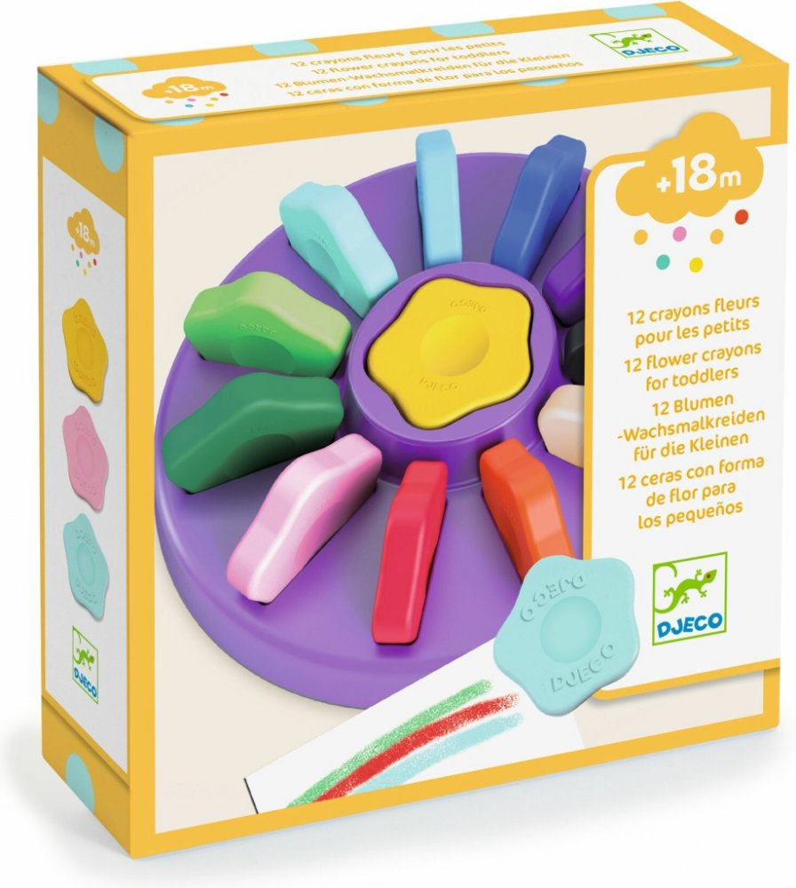 Tyto voskovky pro nejmenší nemají klasický úzký tvar. Jsou široké jako kamínek a tvarem připomínají kvítky. Široké voskovky se prckům lépe drží, díky čemuž se jejich ruka při kreslení tak rychle neunaví. Díky promáčknutí uprostřed a tvarovaným okrajům voskovek si najdou úchop, který jim vyhovuje. Voskovky jsou přehledně uloženy v kulatém stojanu. Výběr barev je takto jednodušší a voskovky mohou zů...