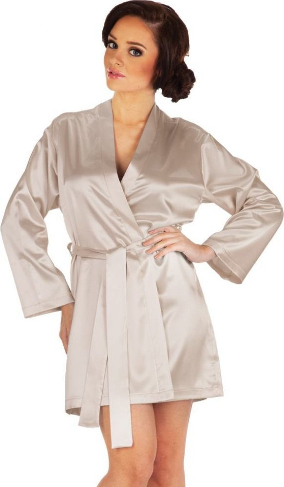 Elegantní smetanově bílý saténový župan s krajkou. Dlouhé rukávy jsou obšité jemnou krajkou. Saténový župan v délce cca 90 cm. Krásný splývavý župan na zavazování pomocí pásku. Šířka krajkového lemu u rukávu cca 8 cm. Župan je lehký pohodlný, vhodný ke košilce značky DKaren. Zboží je dárkově baleno v krabičce. Vhodný dárek, který potěší každou ženu.