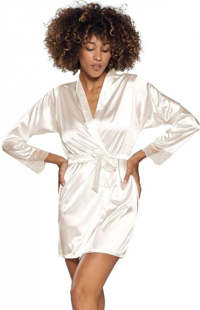 Elegantní dámský župan Gina Dkaren s dlouhými rukávy, které jsou zakončené zdobenou krajkou v krémové barvě. Saténový župan v délce cca 90 cm. Krásný splývavý župan na zavazování pomocí pásku. Šířka krajkového lemu u rukávu cca 8 cm. Župan je lehký pohodlný, vhodný ke košilce značky DKaren. Zboží je dárkově baleno v krabičce. Vhodný dárek, který potěší každou ženu.
