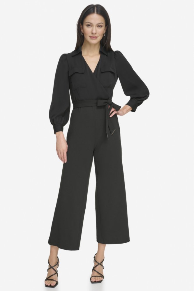 Dámský overal s dlouhými nohavicemi rovného střihu. Jednobarevný design s límečkem, zavinovacím výstřihem do V a našitými kapsami na hrudi doplňuje přestřižený pas s tonální stuhou na zavazování zdobenou lesklým kovovým lemováním. Dlouhý balónový rukáv je ukončen manžetou se zapínáním na kovové knoflíčky stříbrné barvy. Materiálové složení zaručuje dokonalou lehkost, nemačkavý vzhled a komfortní pocit při nošení. Velmi nápaditý kousek, který bude ozdobou vašeho sportovně-elegantního i formálního outfitu.