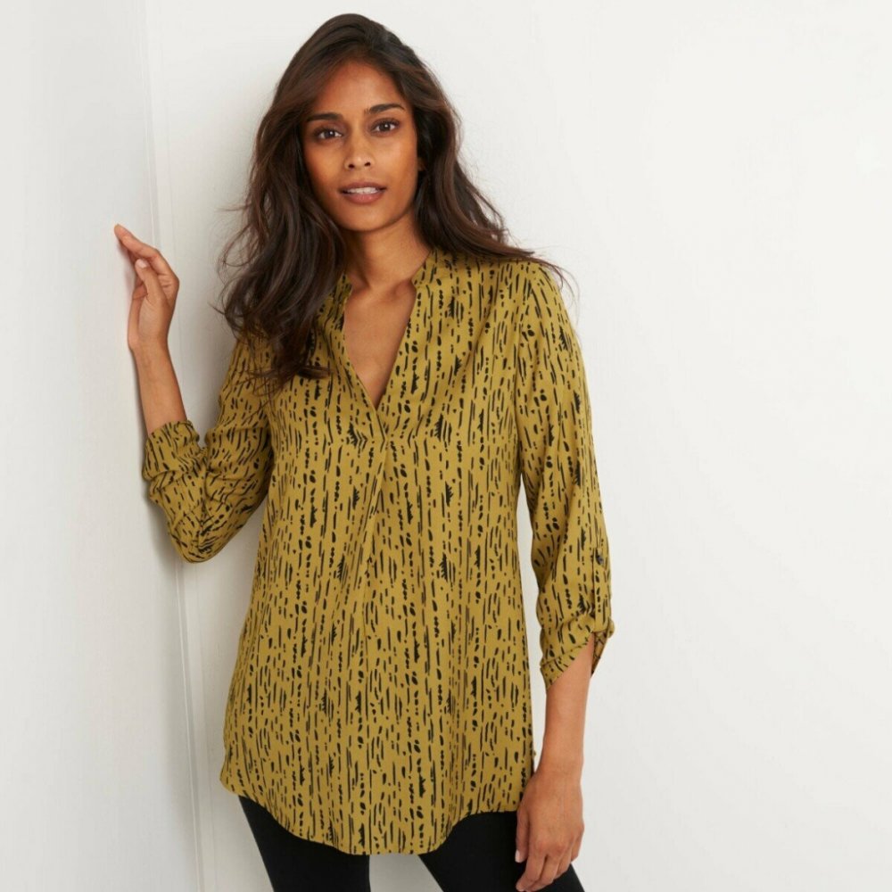 Stylová, lehoučká a pohodlná: tuto halenku s potiskem snadno zkombinujete s Vašimi oblíbenými kousky. Ze vzdušného krepu. Tuniský výstřih s překřížením do "V". Pod výstřihem sklady. Dlouhé rukávy s knoflíkovou patkou pro 3/4 ohrnutí. Zakulacený spodní lem. Lze prát v pračce.