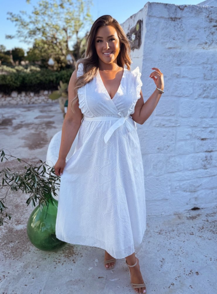 Dlouhé bílé bavlněné dámské šaty s madeirovou krajkou, výstřihem do V a krátkými volánkovými rukávy. Šaty mají pružný pas a pásek. Modelka měří 168 cm a má na sobě velikost XL/XXL.