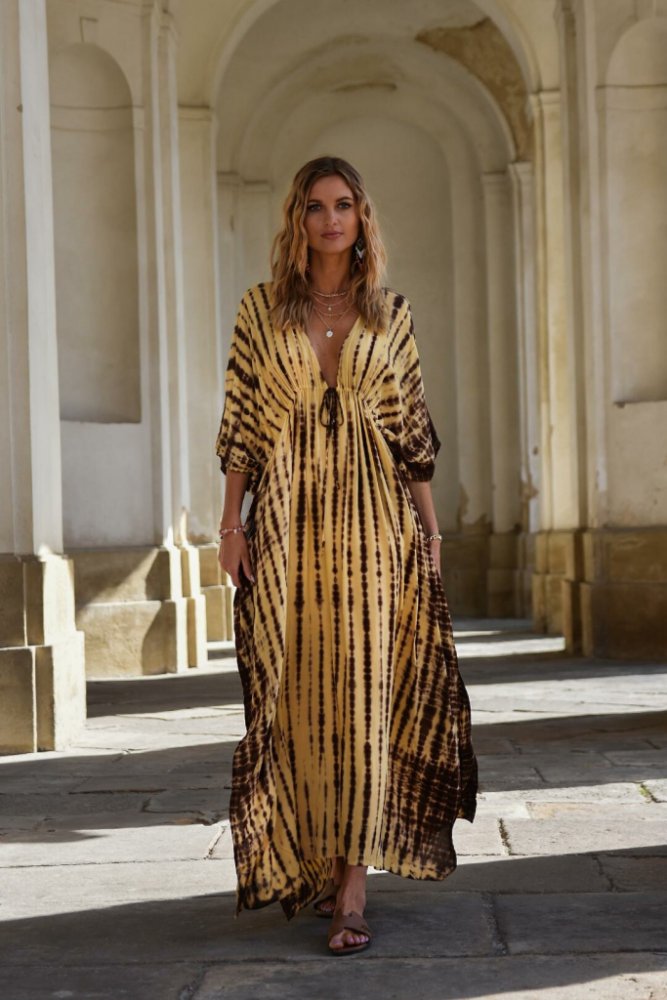 DLOUHÉ BOHO ŠATY PECA del SOL: dlouhé boho šaty z umělého hedvábí PECA del SOL letní šaty z velice příjemného materiálu jsou lehké, chladivé a splývavé výstřih do V s jemným řasením a zavazováním pod prsy - můžete si přizpůsobit rukávy jsou 3/4 a celkový volný střih šatů v univerzální velikosti zajišťuje maximální pohodlí i eleganci vzdušný materiál, který je perfektní do horkého počasí šaty mají ...