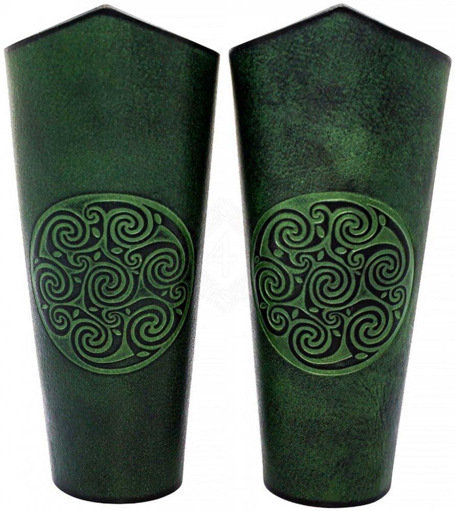 Nátepníky jsou anatomicky tvarované tak, aby kopírovaly tvar lidského předloktí. Směrem k lokti se mírně rozšiřují a jsou zakončeny decentní špičkou, což zajišťuje pohodlný ohyb ruky bez tlačení. Dominantním prvkem je hluboká ražba s motivem spirál, která připomíná tradiční keltské ornamenty. Tento detail je precizně proveden a dodává chráničům plasticitu.