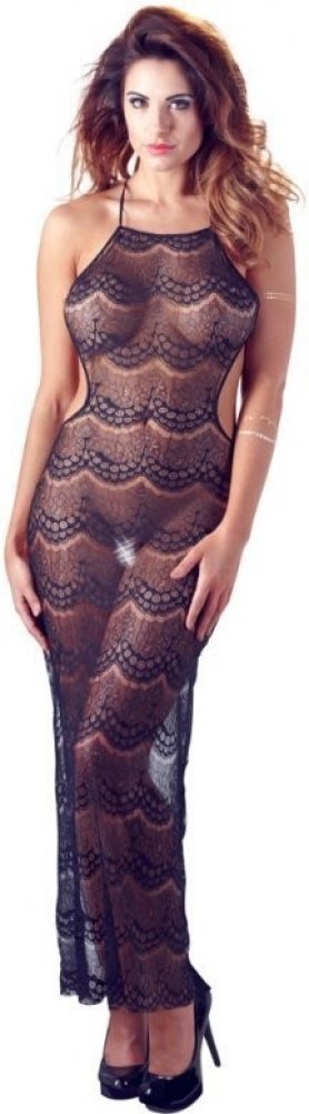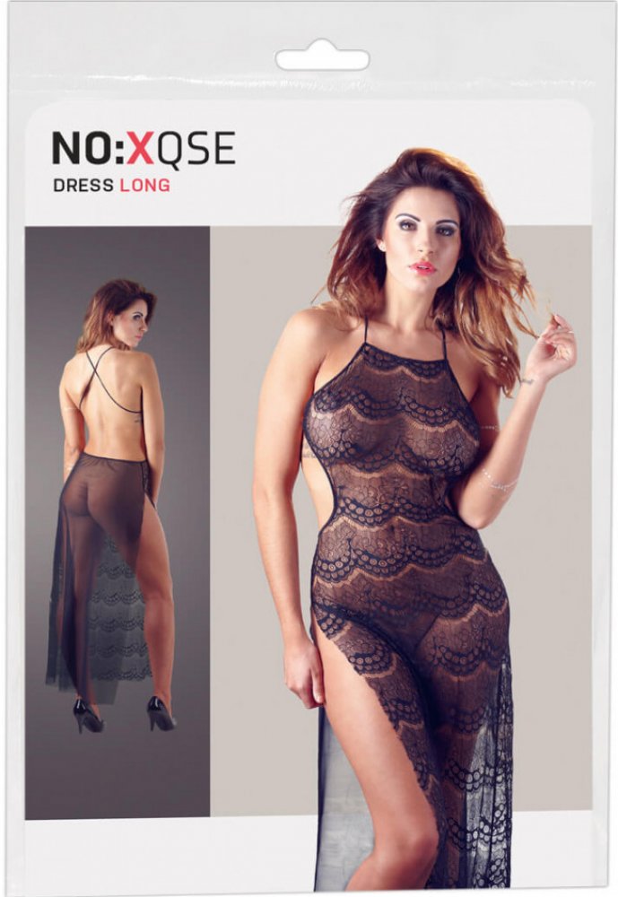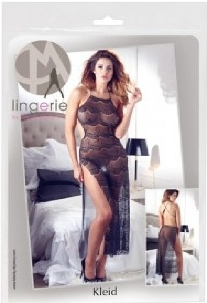 Ten pravý wow efekt pro vaší postavu!Dlouhé, průsvitné šaty bez rukávů, s volnými zády a vysokým rozparkem až k boku na pravé straně. Ve vzrušující kombinaci materiálů - tylu a krajky ve vlnovitém designu, vzadu je pouze jemný průsvitný tyl. Elastická ramínka se kříží na zádech. Lemování není sešívané.Materiál: Tyl 100% polyester, krajka 100% polyamid.Značka: Mandy Mystery, kolekce lingerie.