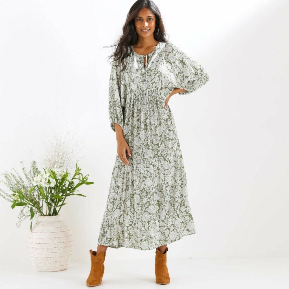 Z lehkého kreponu a s potiskem květin, dlouhé šaty představují ideální kousek pro letní sezónu. Kulatý výstřih s průstřihem a šňůrkami na zavázání. Vpředu náprsenka, vzadu nařasení. Široké rukávy k loktům. Pružné konce rukávů. Dolní lem se 2 nařasenými volány. Lze prát v pračce.
