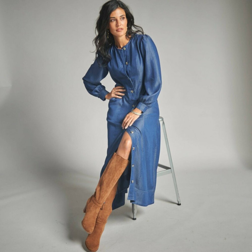 Dlouhé šaty v džínovém vzhledu sluší každé postavě. Jemný lehký materiál. Kulatý výstřih. Vpředu knoflíková léga. V pase přestižení pro vypasování. Vpředu a vzadu přestřižení. Dlouhé rukávy, nařasené manžety s knoflíkem a rozparkem. 2 šikmé kapsy. Rozšířený střih. Lze prát v pračce.